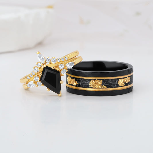 Crushed Meteorite with Gold Leaves Tungsten Ring for Men