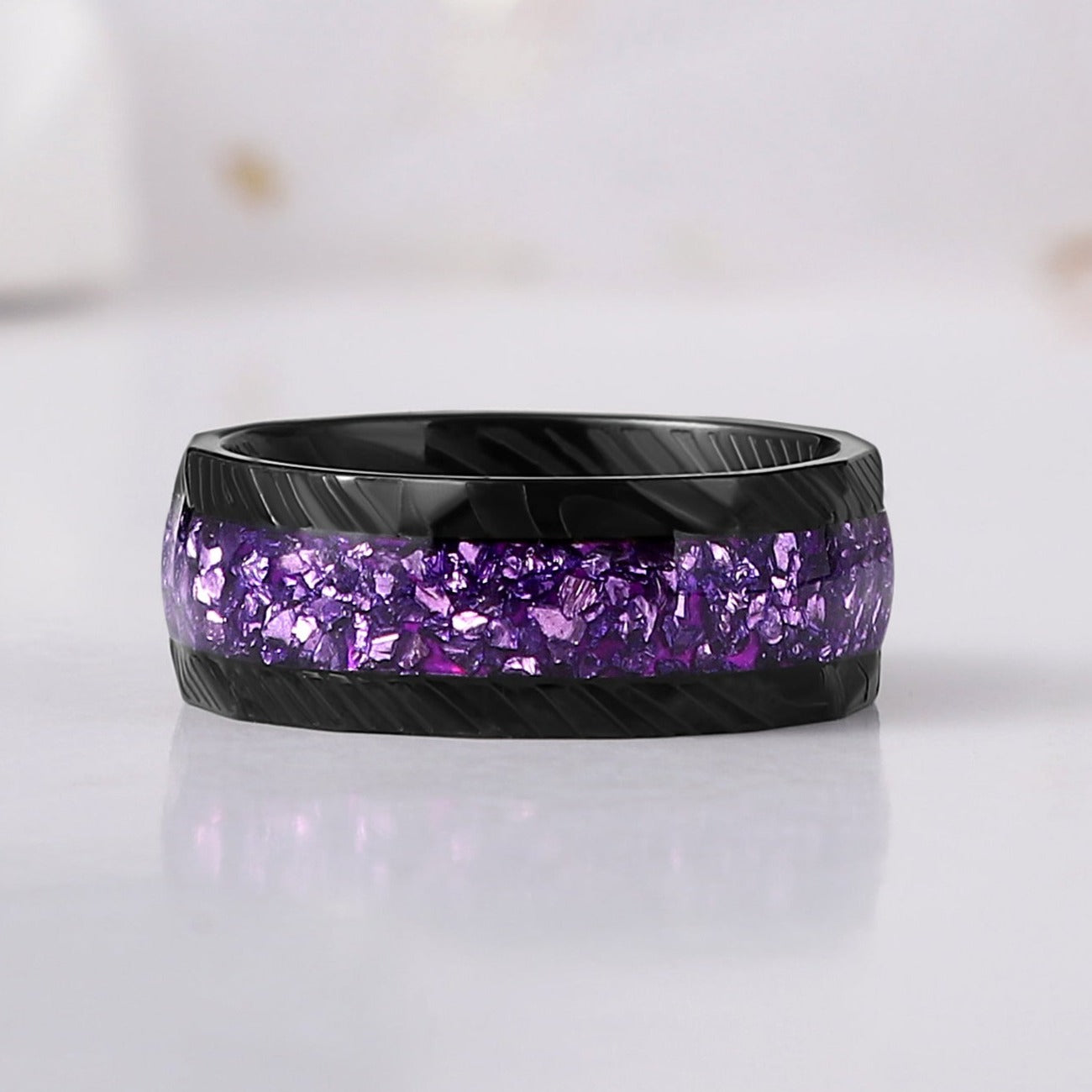 This men's ring is a striking piece crafted from robust steel, celebrated for its durability and strength. This ring features a unique inlay of purple fire opal, which dazzles with its fiery play of colors. The combination of the sleek steel and the vibrant opal creates a modern and bold design, ideal for the contemporary man who appreciates both style and resilience.