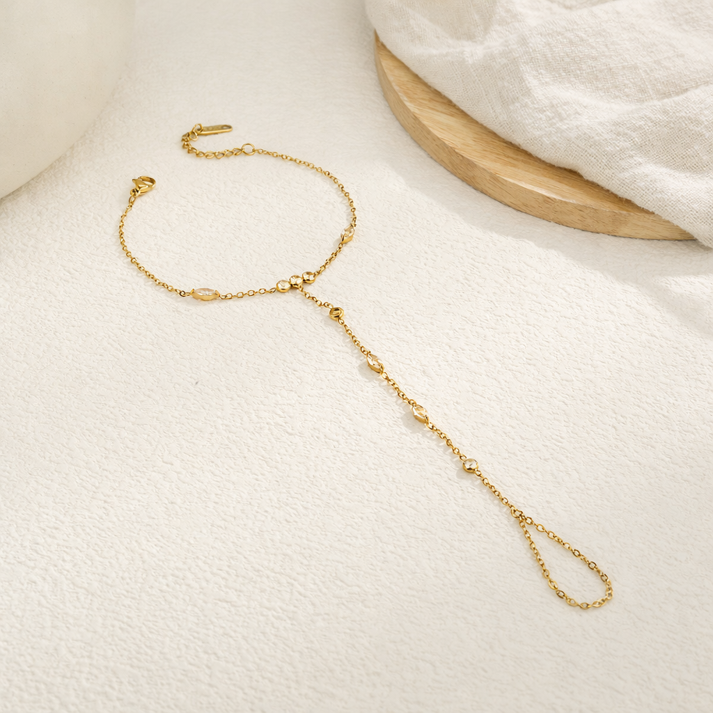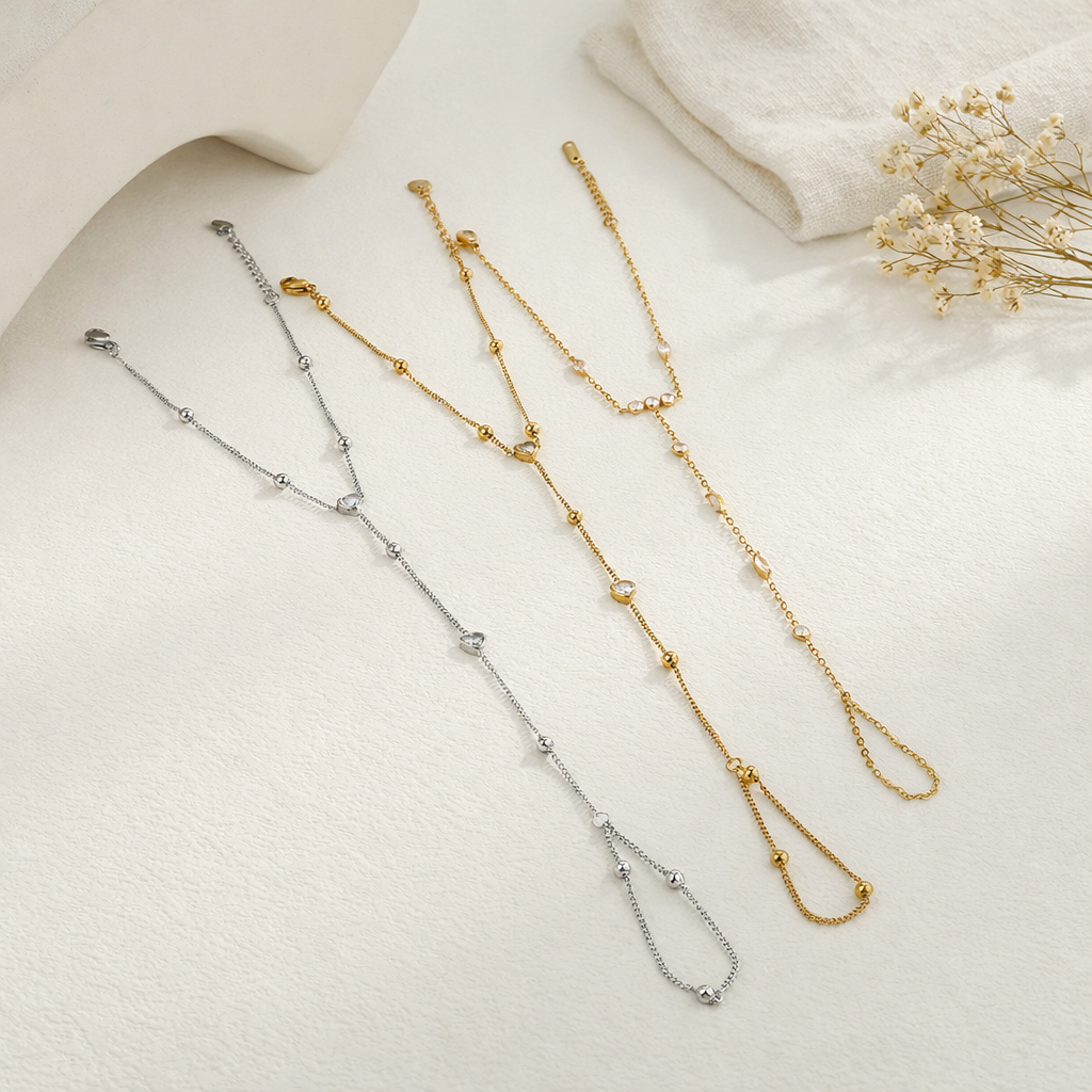 Elevate your everyday look with this elegant hand chain finger bracelet set, crafted from durable stainless steel and finished in premium 18K gold and silver plating. Designed with a minimalist yet feminine aesthetic, these finger bracelets connect gracefully from wrist to finger, making them perfect for daily wear, layering, or special occasions. Tarnish-resistant, lightweight, and comfortable, this versatile bracelet set adds a subtle statement of modern elegance to any outfit.