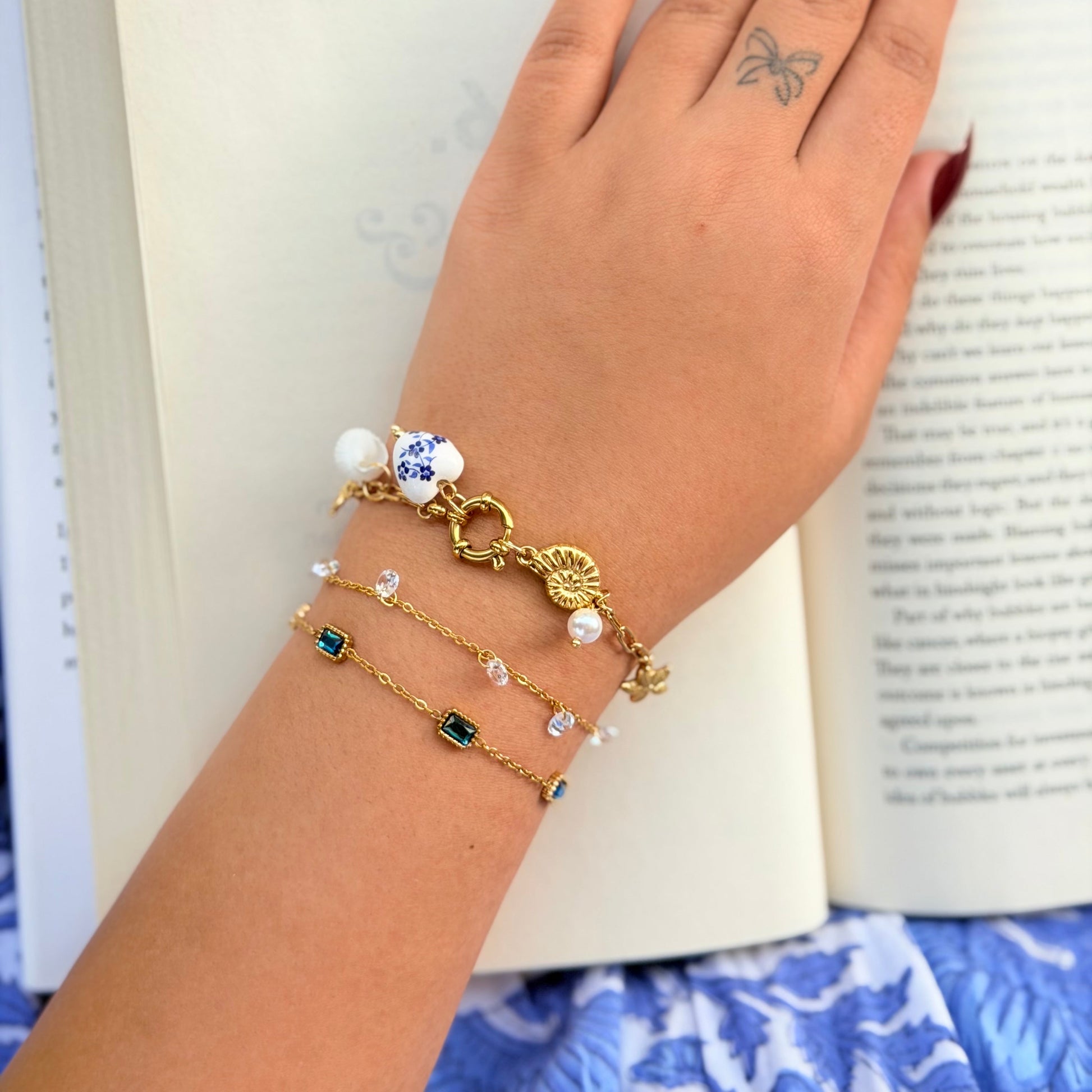 Elevate your look with this 18K gold plated bracelet stack, featuring coastal-inspired charms, pearls, and vibrant stones—perfect for adding a chic, beachy touch to any outfit.