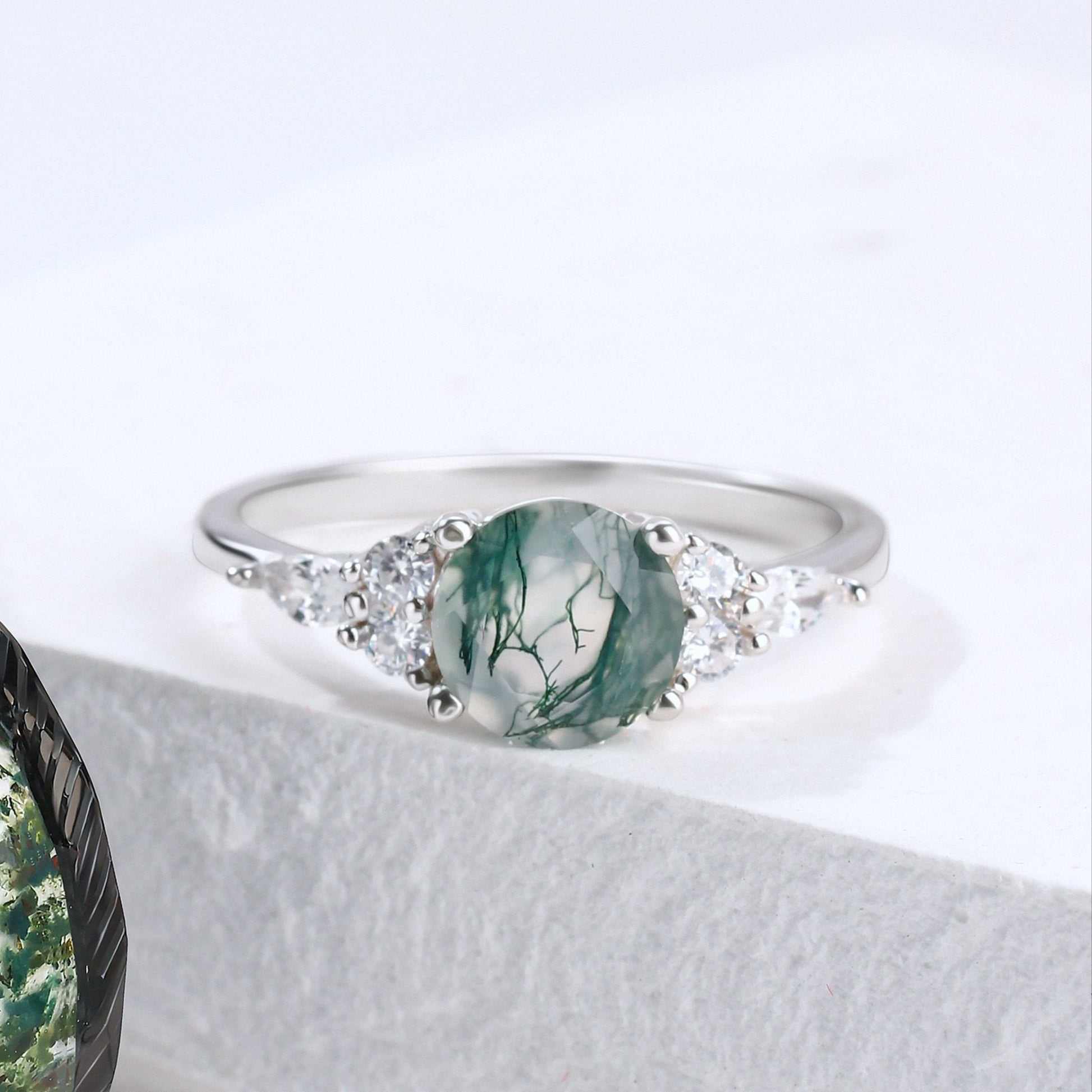 The Forestine - Round Cut Green Moss Agate Promise Ring for Women