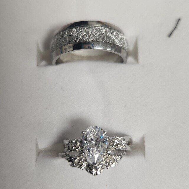 Celebrate your everlasting bond with this elegant couple ring set. The women’s ring features a pear cut simulated diamond set in 925 sterling silver, offering timeless sparkle and sophistication. The men’s ring is crafted from durable tungsten, symbolizing cosmic strength and eternity. Together, these matching rings represent love that shines as bright as the stars and endures as strong as the universe—perfect for engagements, weddings, or anniversary gifts.