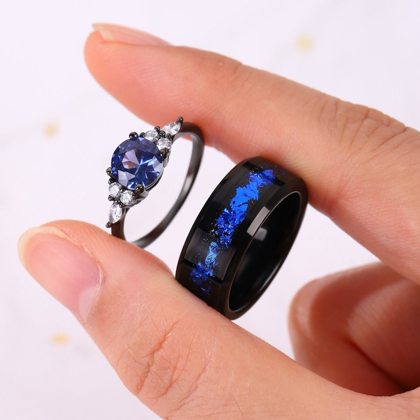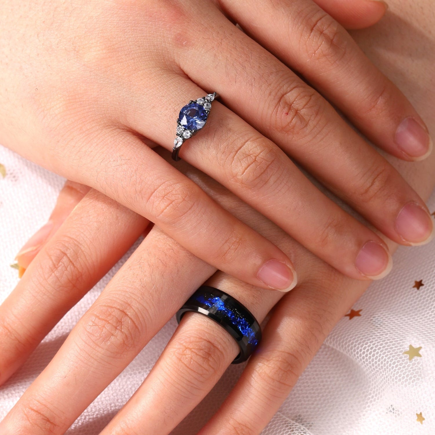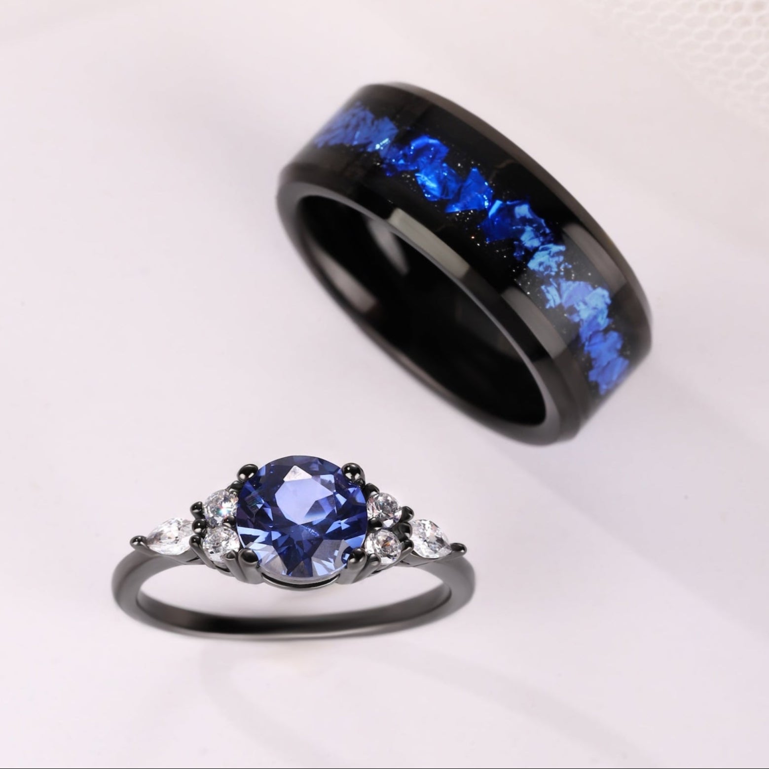 Elegant couple ring set featuring vibrant blue corundum and shimmering black sandstone. Crafted in premium 925 sterling silver and durable black tungsten, this matching set blends timeless romance with modern luxury.