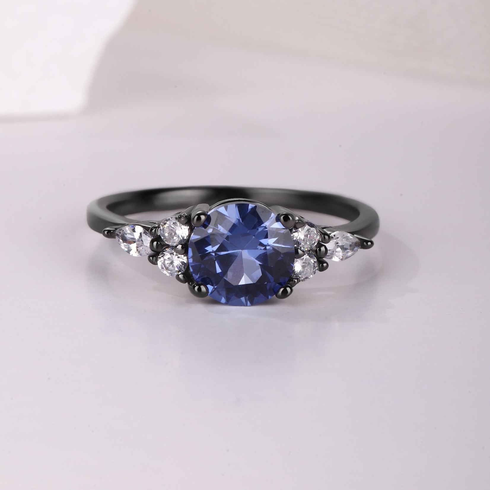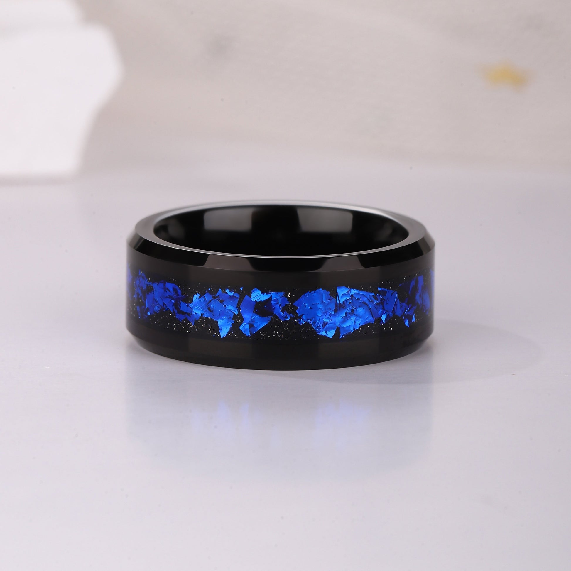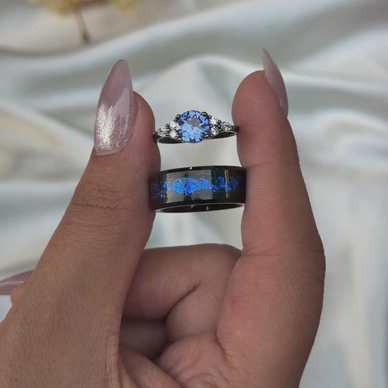 Elegant couple ring set featuring vibrant blue corundum and shimmering black sandstone. Crafted in premium 925 sterling silver and durable black tungsten, this matching set blends timeless romance with modern luxury.