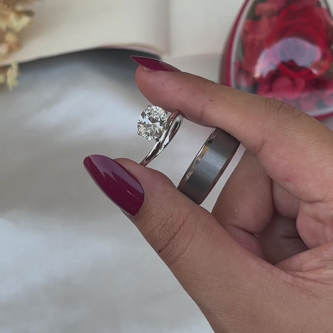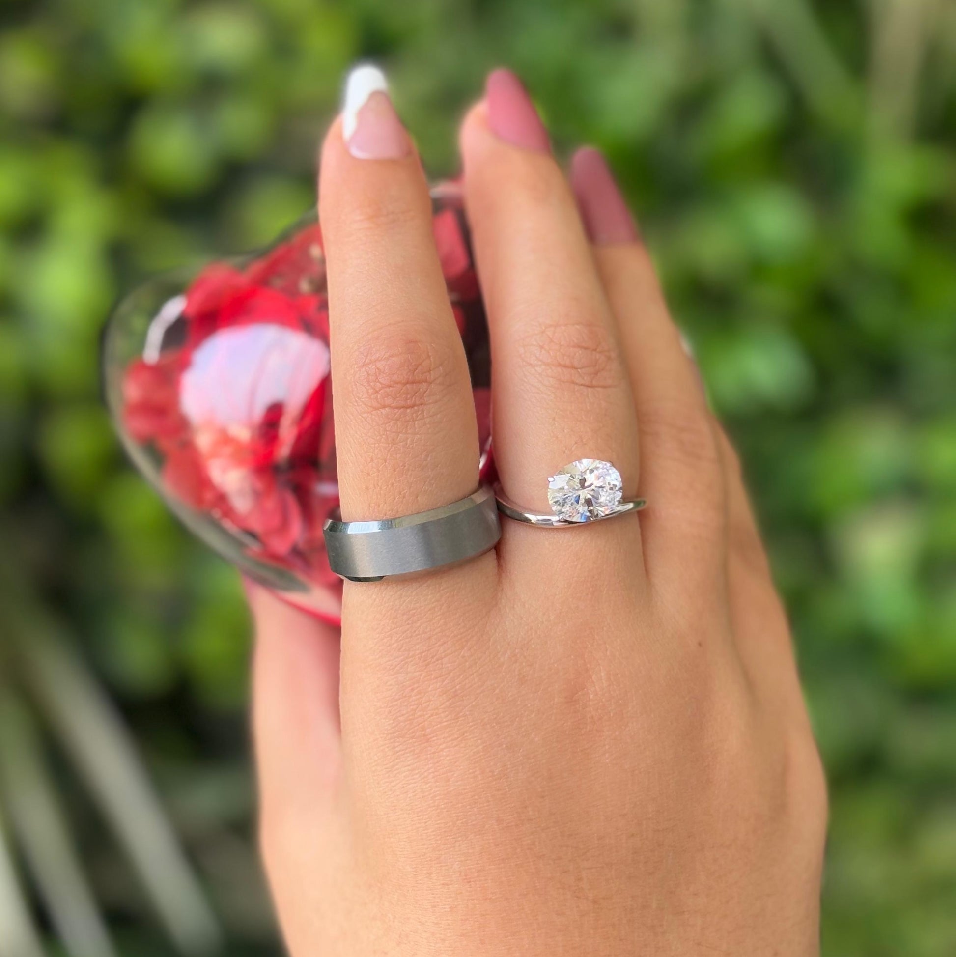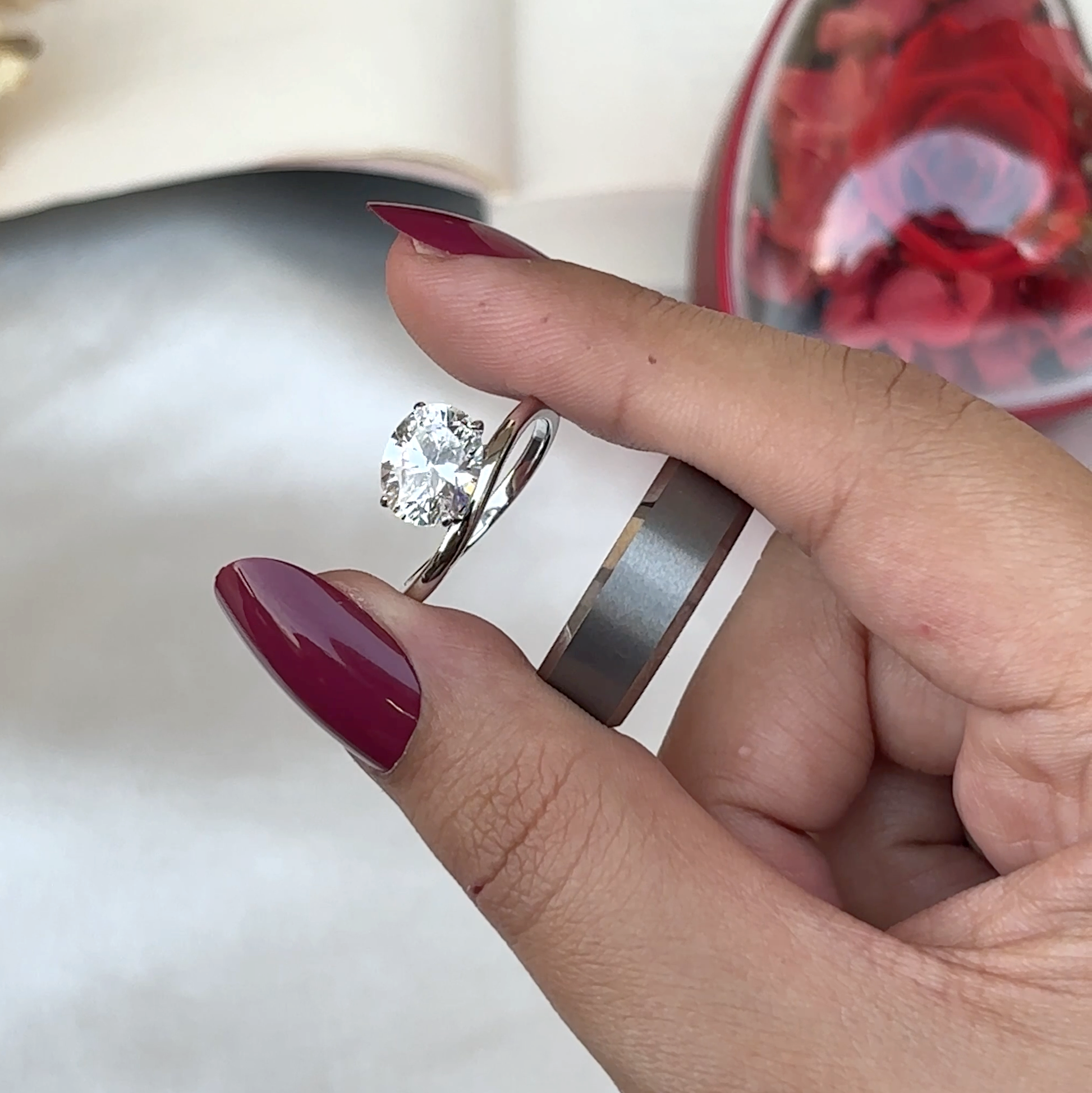 Celebrate your forever with this elegant couple ring set, crafted to symbolize enduring love and commitment. The women’s ring features a dazzling 2.5 Ct. simulated diamond set in premium 925 sterling silver. The men’s ring is crafted from durable silver tungsten, blending strength with sophistication.
