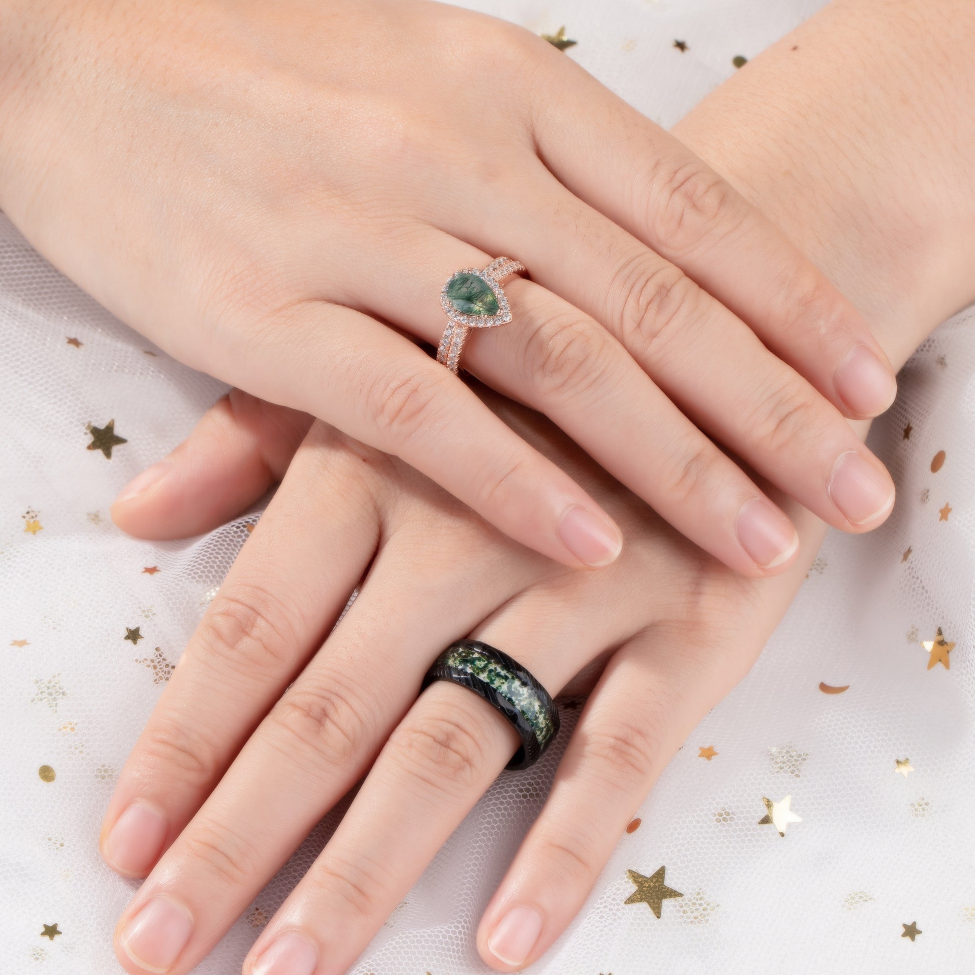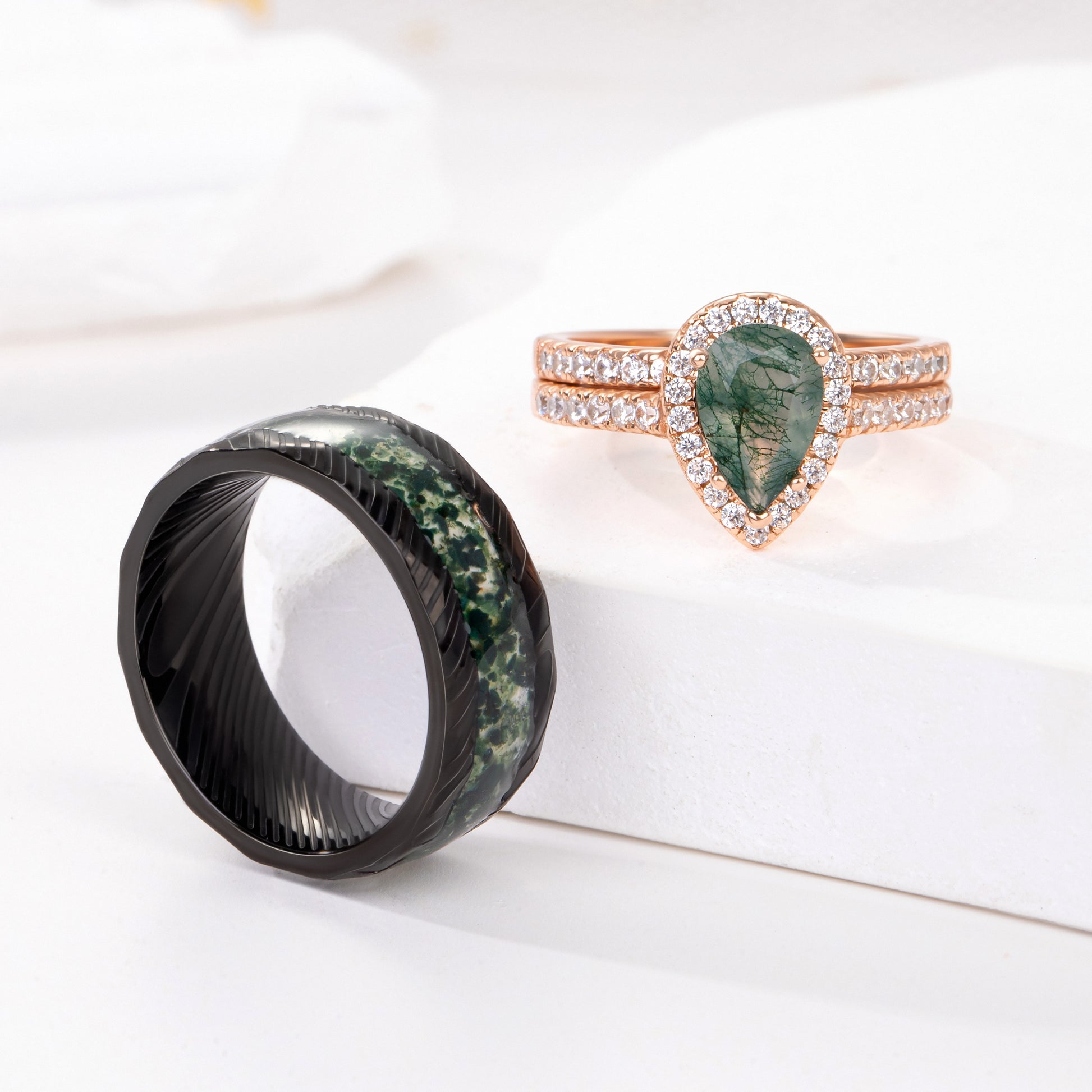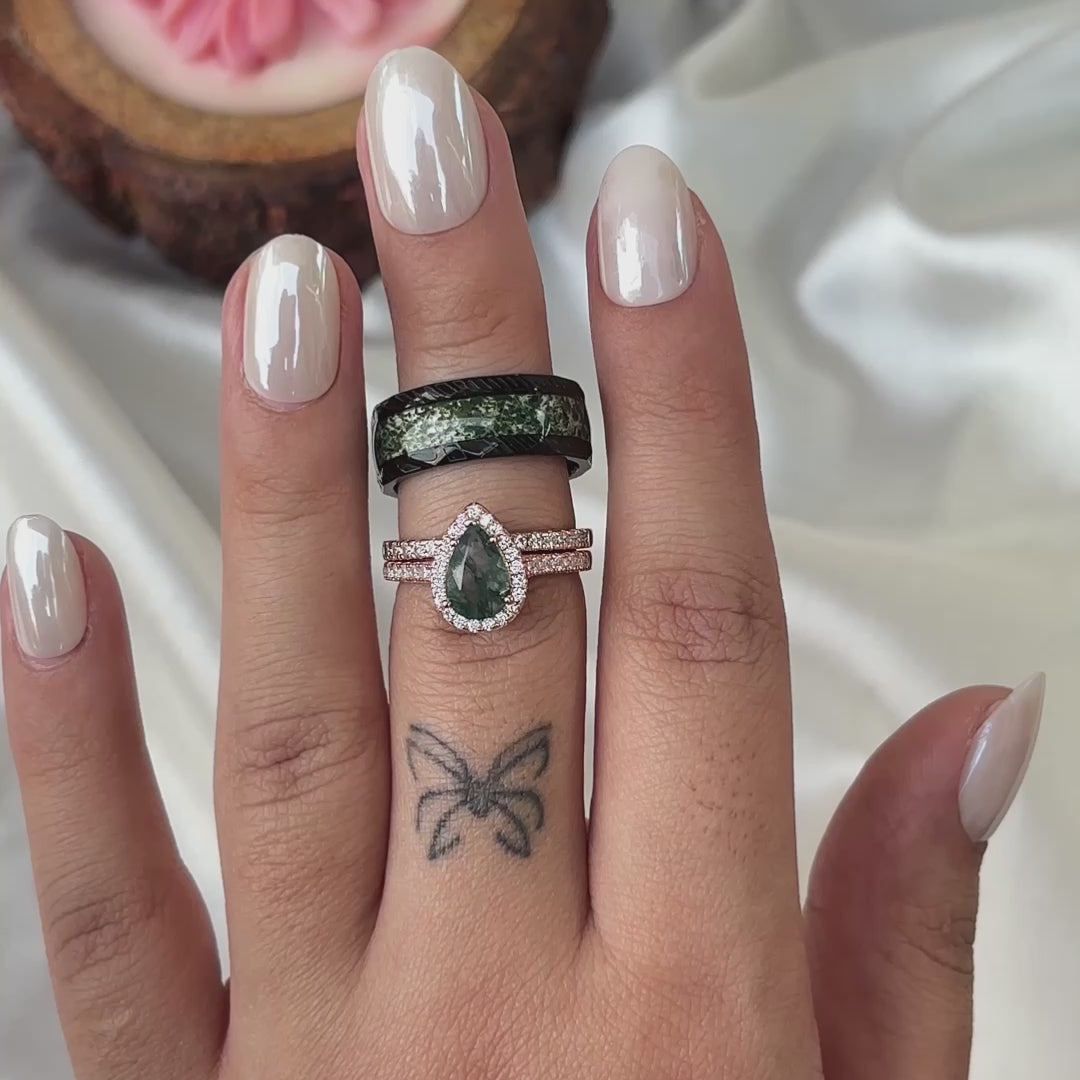The men’s ring, made of durable tungsten, showcases a striking moss agate inlay, seamlessly blending natural charm with modern strength. The rich green veins within the stone symbolize balance, renewal, and a love that stands the test of time.