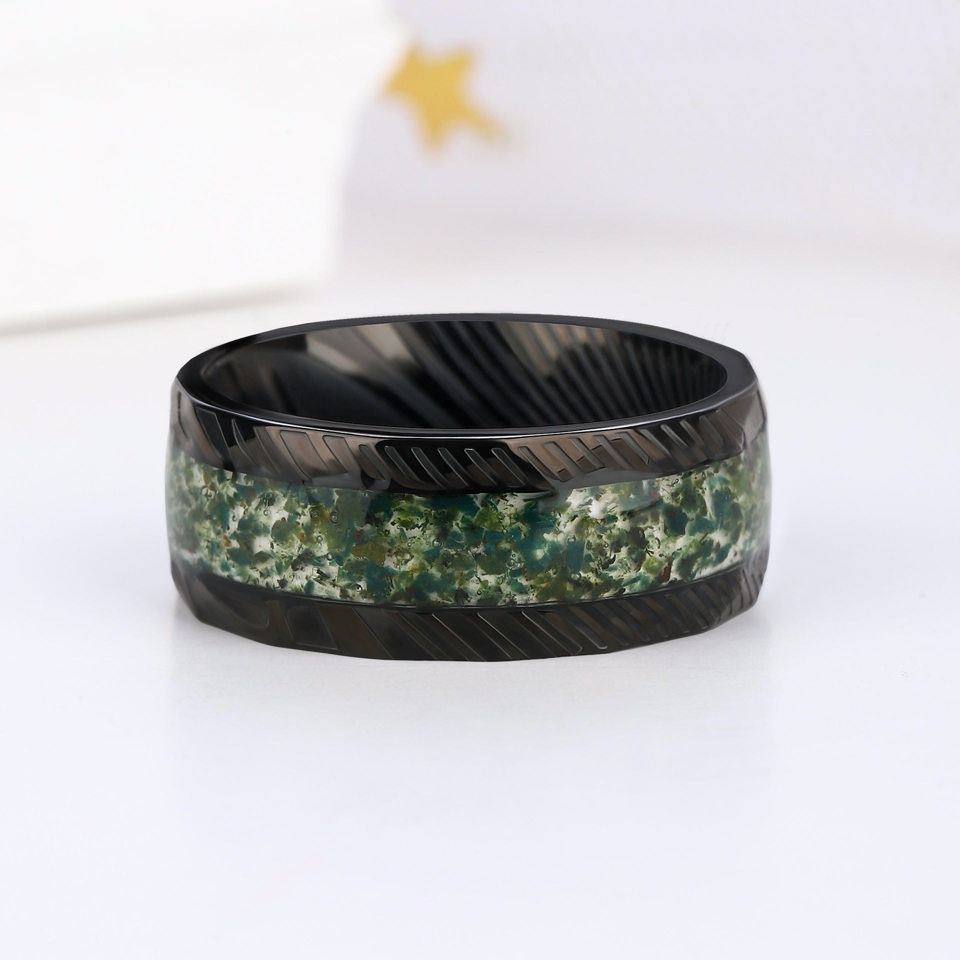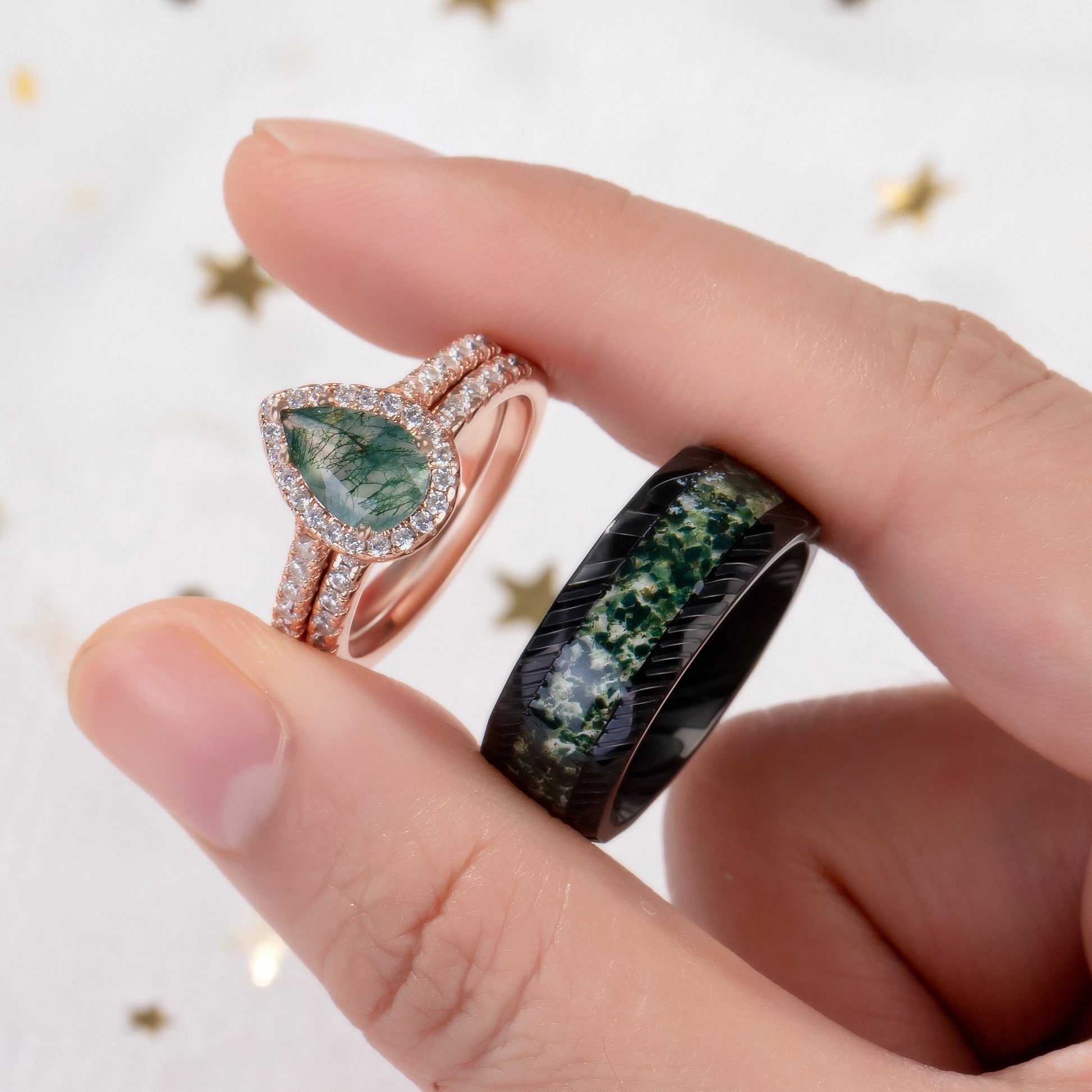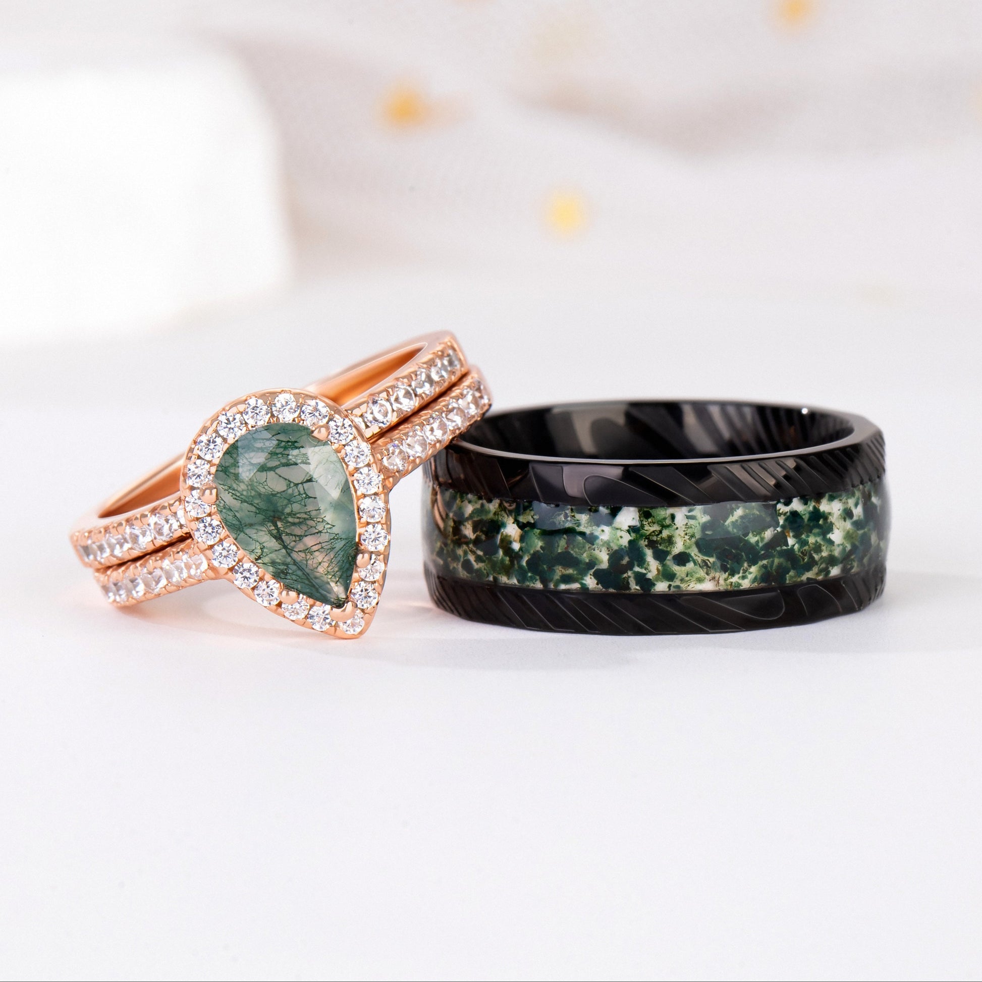 The men’s ring, made of durable tungsten, showcases a striking moss agate inlay, seamlessly blending natural charm with modern strength. The rich green veins within the stone symbolize balance, renewal, and a love that stands the test of time.