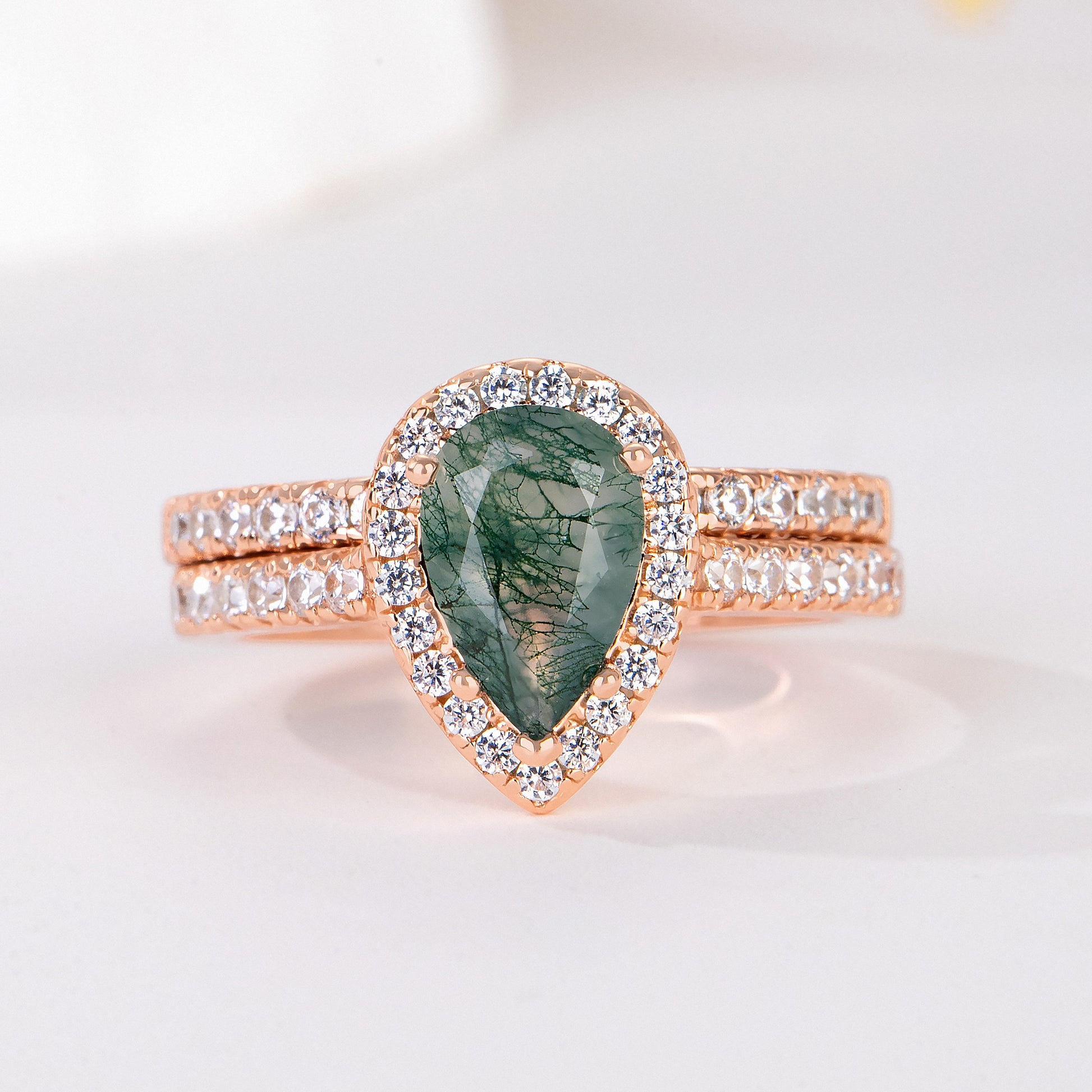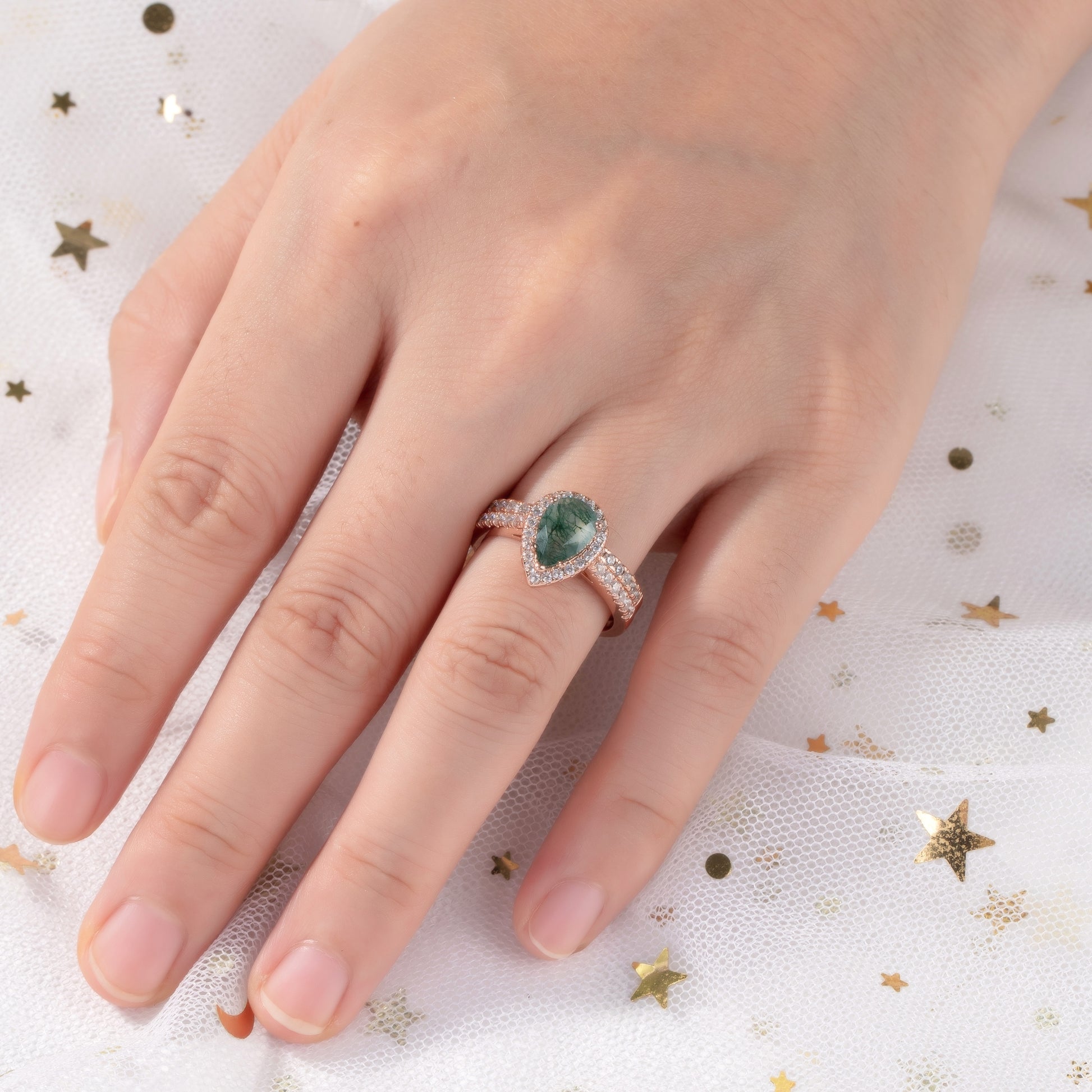 The women’s ring, crafted from solid 925 sterling silver with 18k rosegold plated, features a mesmerizing pear-cut moss agate, known for its unique, nature-inspired patterns resembling lush forests. The elegant setting enhances the stone’s organic beauty, making it a perfect reflection of love that grows with time.