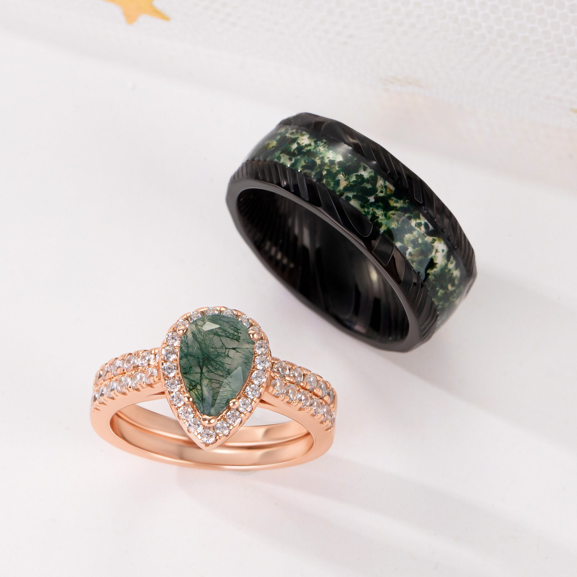 The Evermoss - Natural Moss Agate Couple Rings Rosegold Vermeil