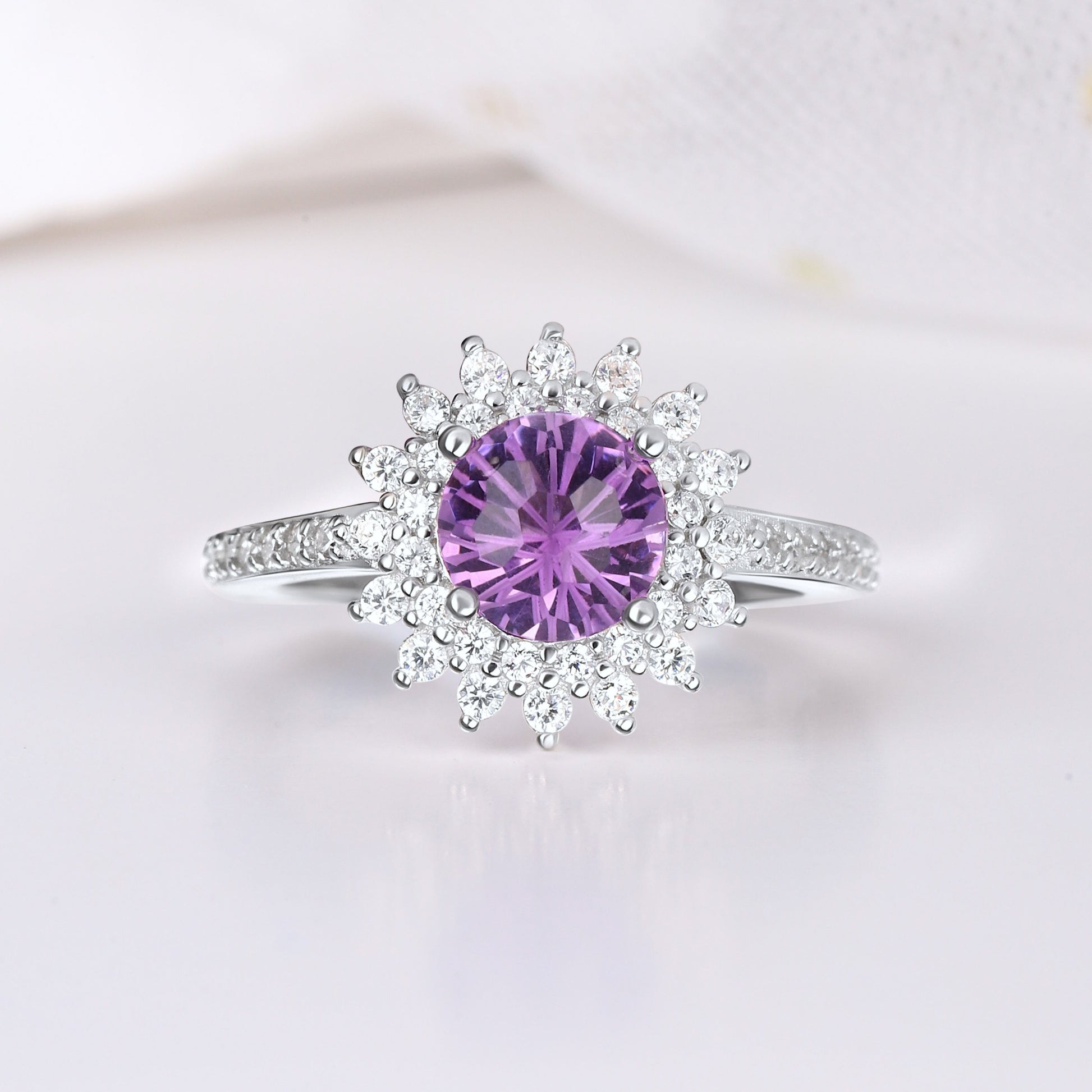 The women's ring, crafted from luxurious 925 silver, holds a stunning 1.25-carat / 7MM firework amethyst in a round cut, radiating a mesmerizing spectrum of deep purples and flickering light, like a precious ember.