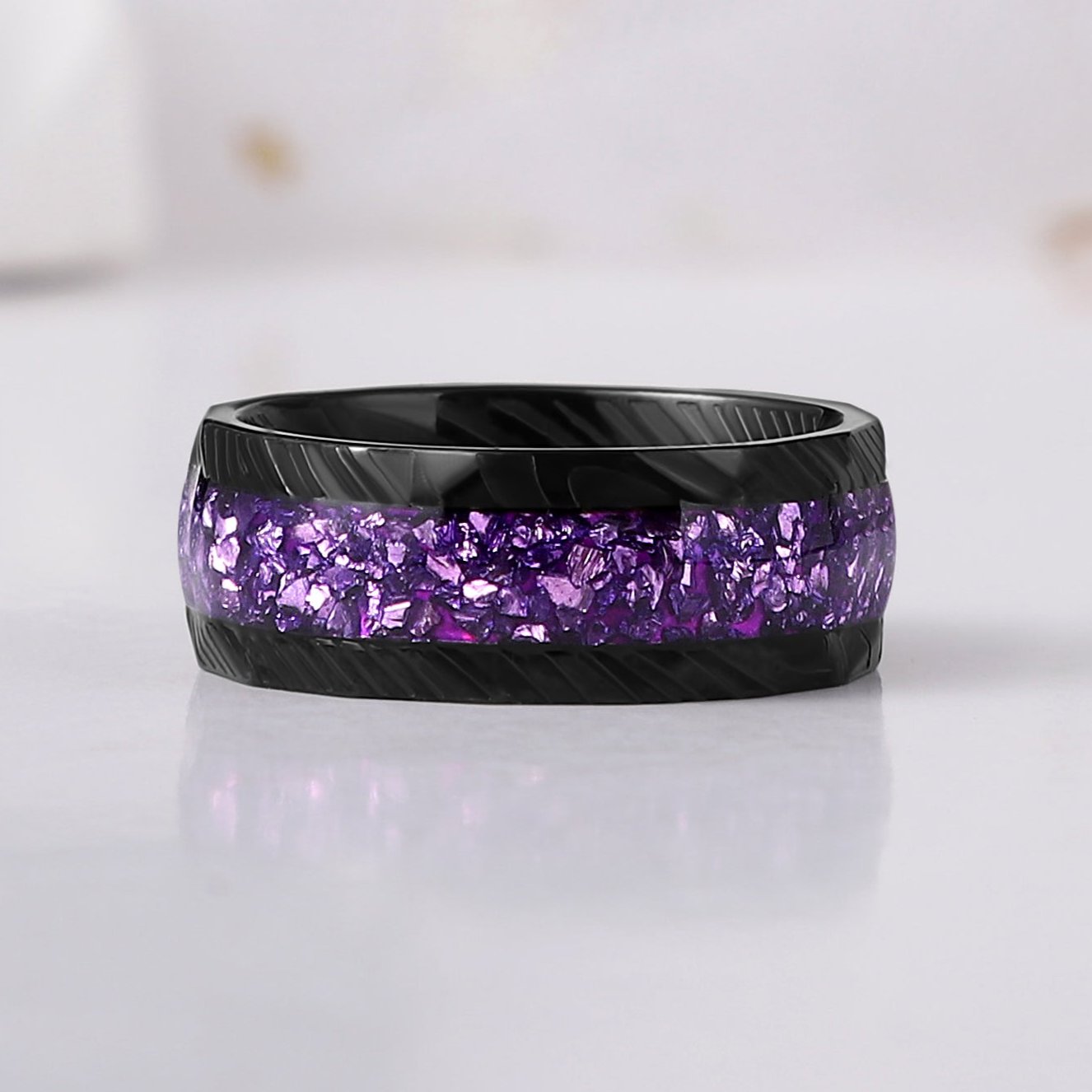 Accentuated by the durability of tungsten, the men’s ring showcases a distinctive crushed amethyst inlay, adding a rich, natural texture with a subtle yet powerful hue.