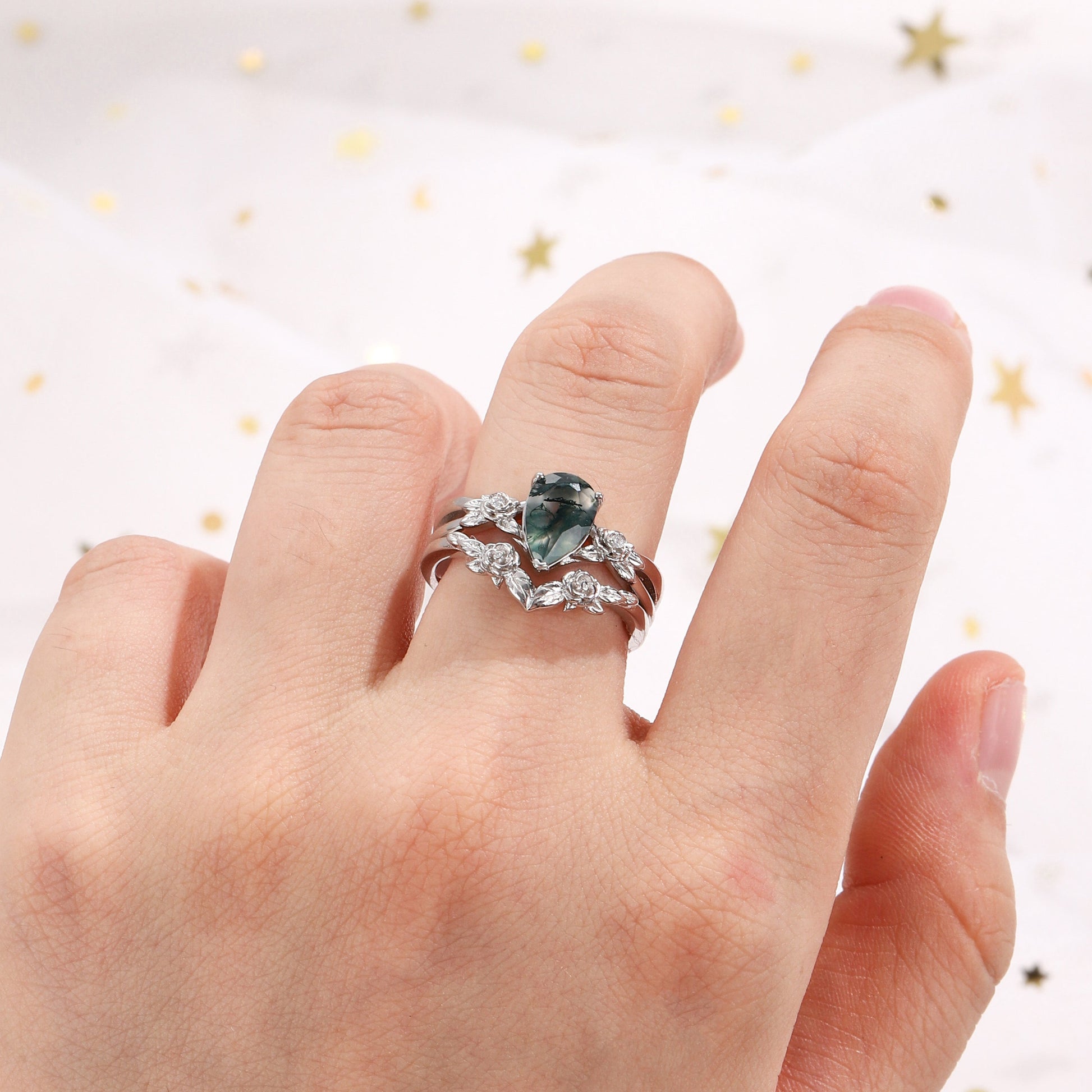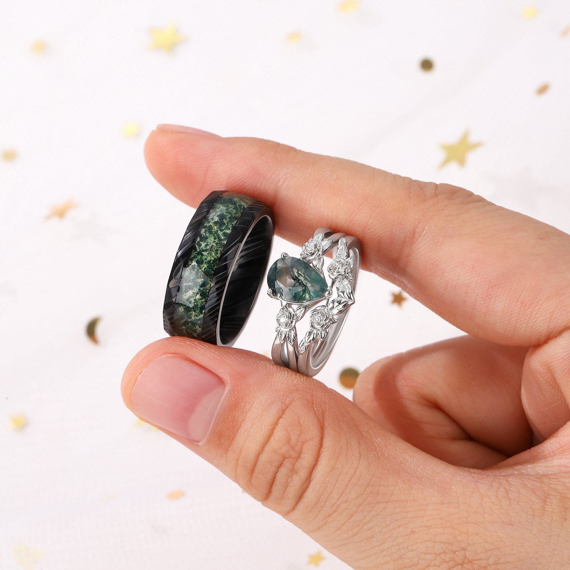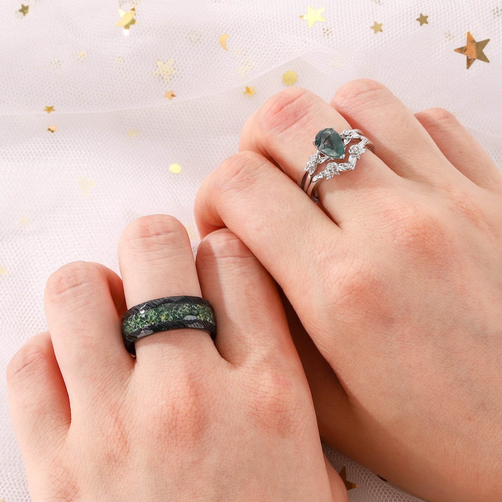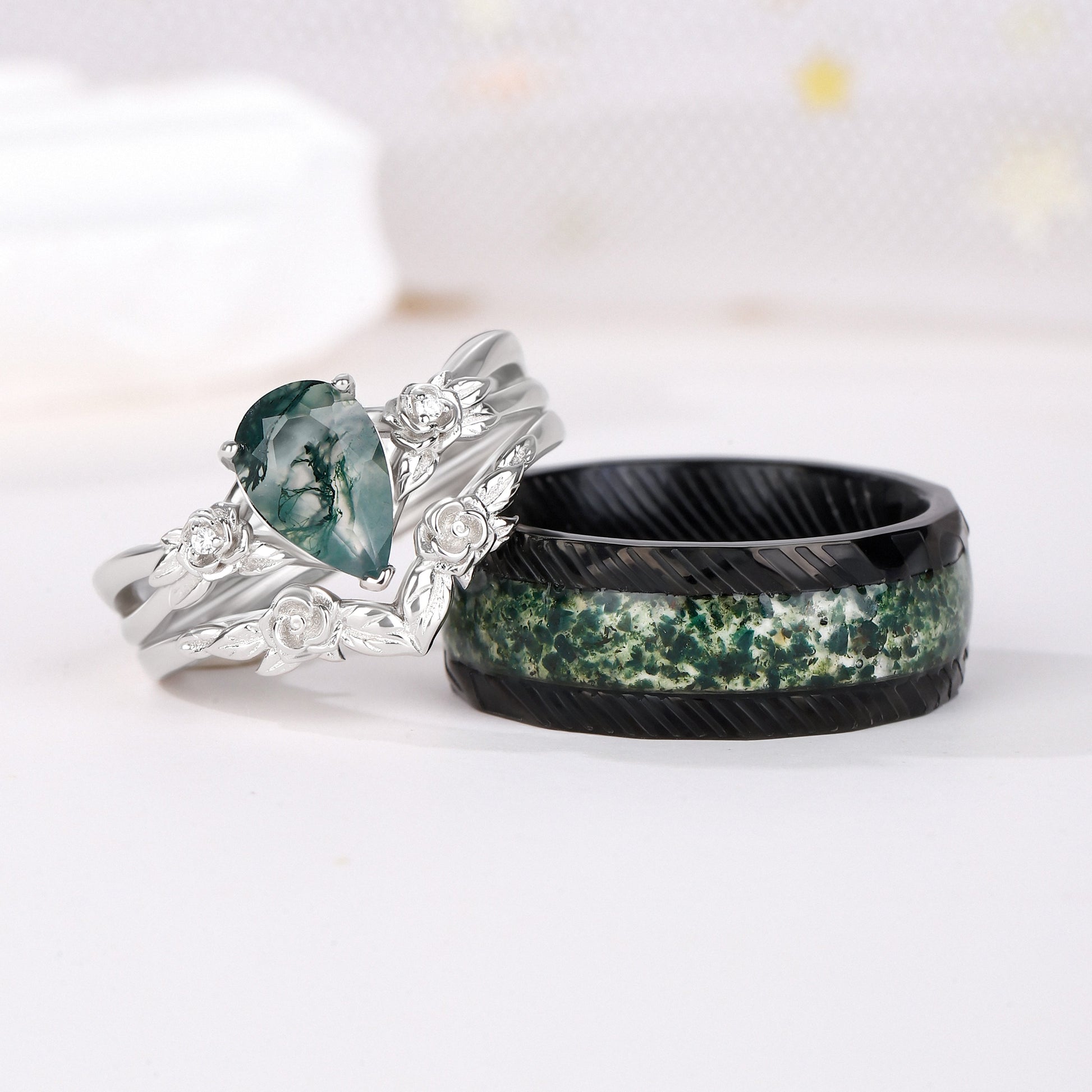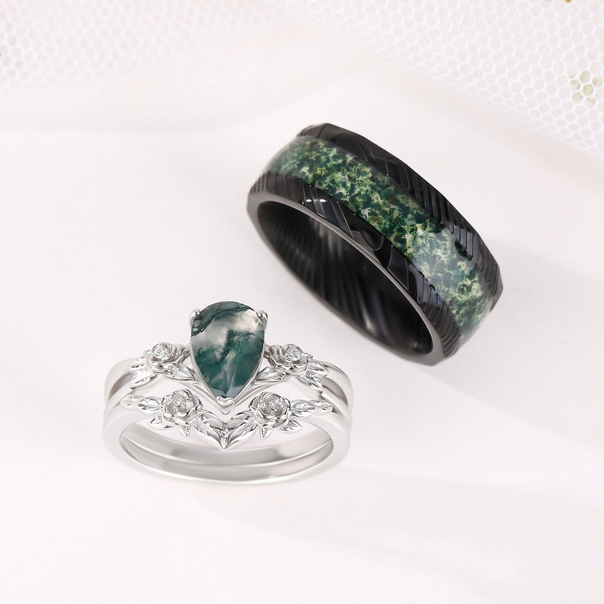 Celebrate your love with this enchanting pair — a women’s ring crafted in 925 sterling silver with a pear-cut moss agate centerpiece, framed by delicate floral and leaf details, and a men’s ring in tungsten featuring a polished band inlaid with natural moss agate. A perfect balance of elegance and strength, inspired by nature’s timeless beauty.