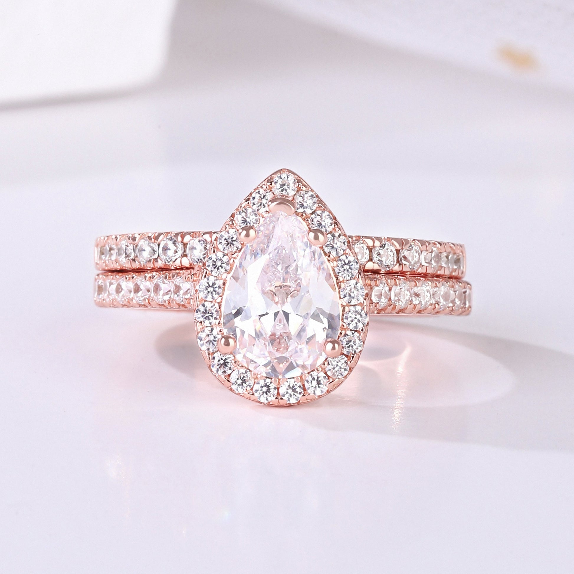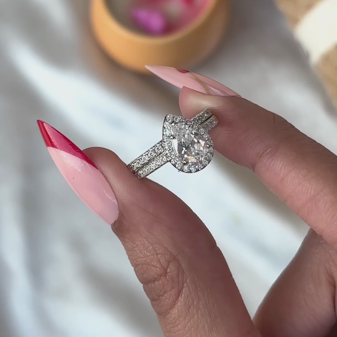 The women’s set is a stunning duo of a ring and matching band, designed to capture hearts. The centerpiece is a dazzling pear-shaped white diamond, delicately set to reflect brilliance from every angle.