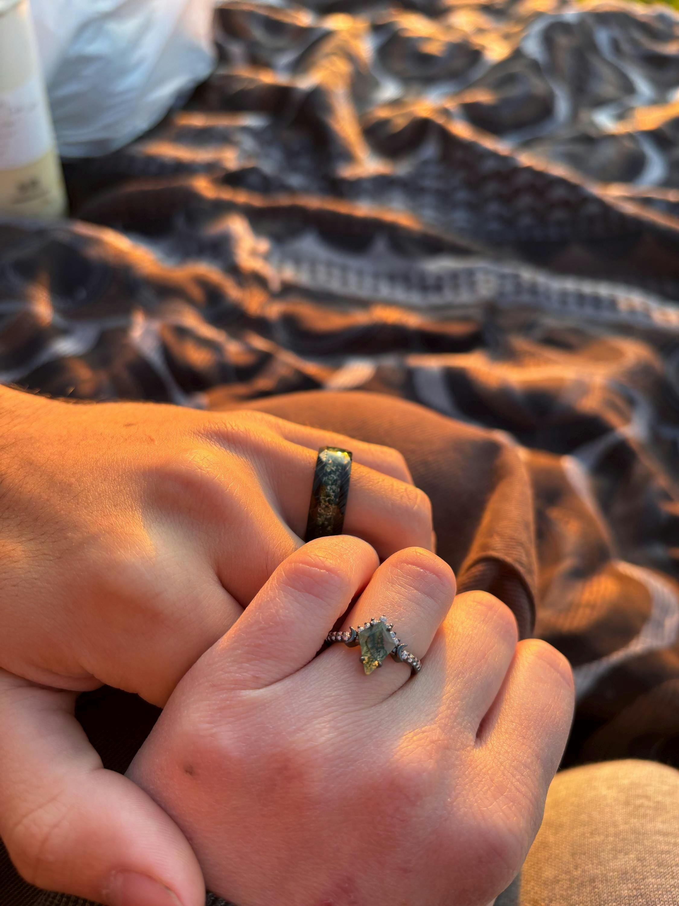 Celebrate timeless love with this kite cut Moss Agate couple ring set. The men’s band is crafted in durable tungsten with natural Moss Agate inlay, while the women’s ring features a striking kite cut Moss Agate set in 925 sterling silver with sleek black rhodium plating. A perfect blend of nature, strength, and elegance for couples.