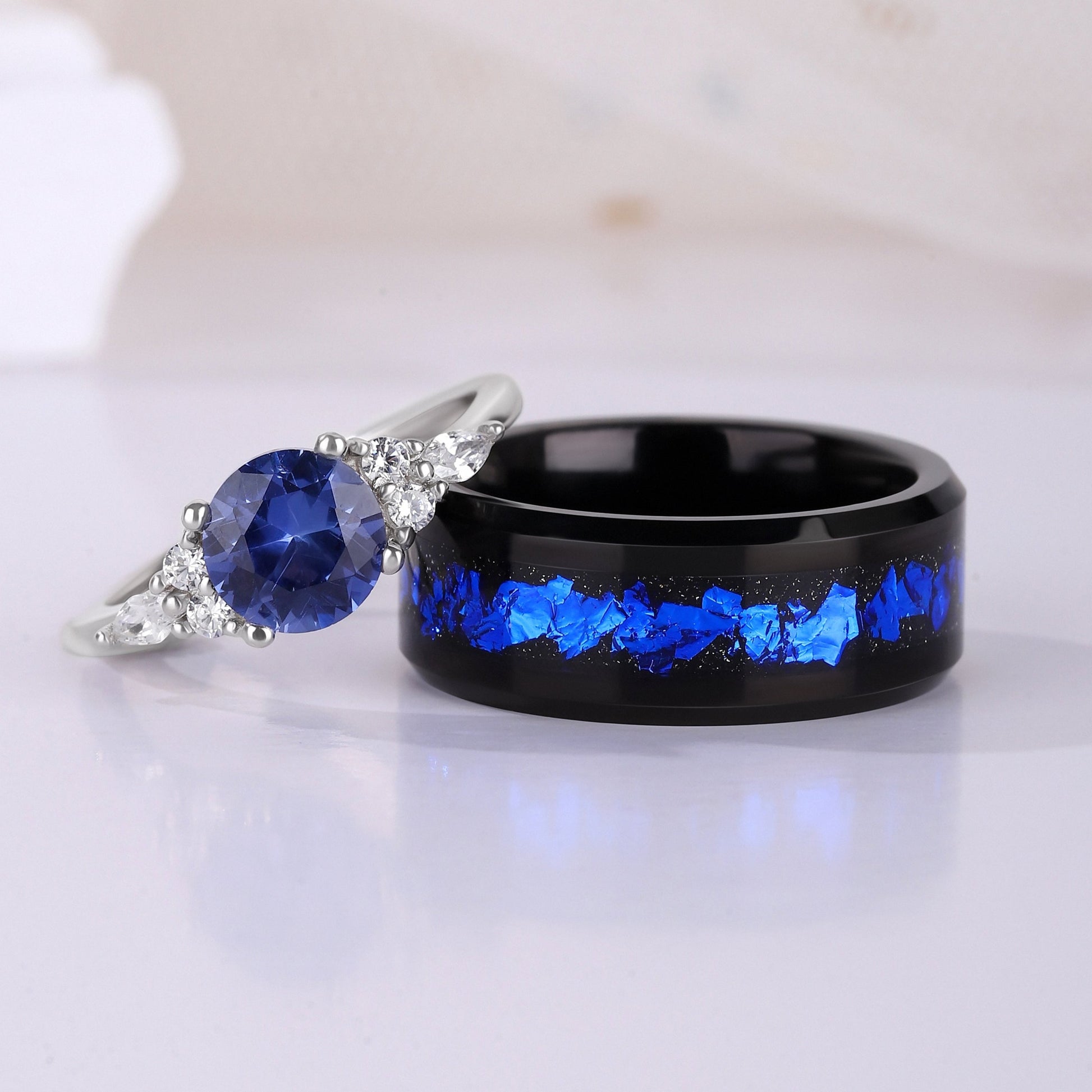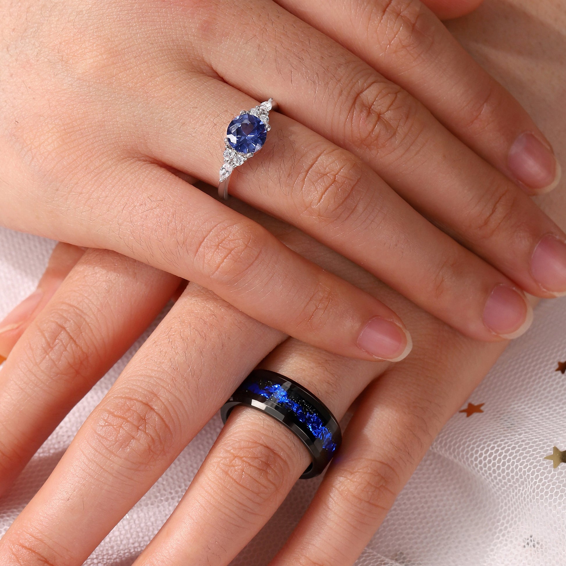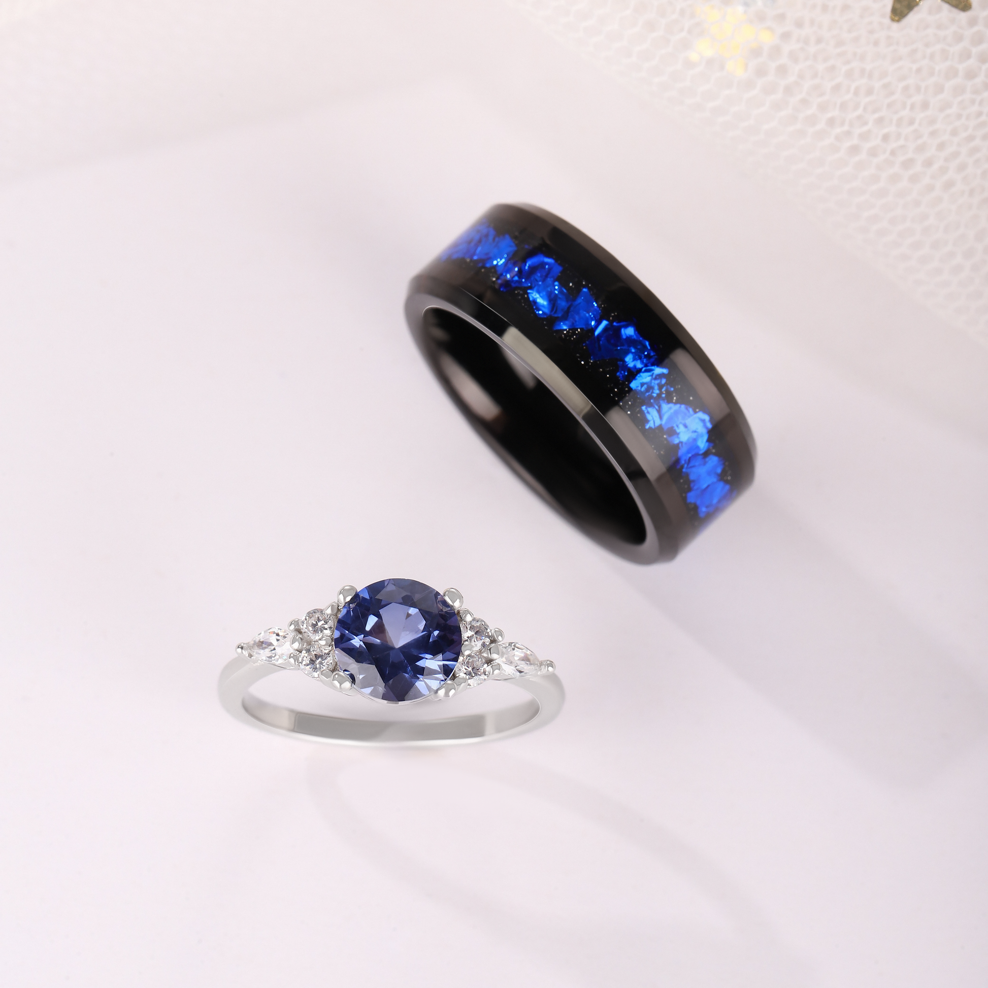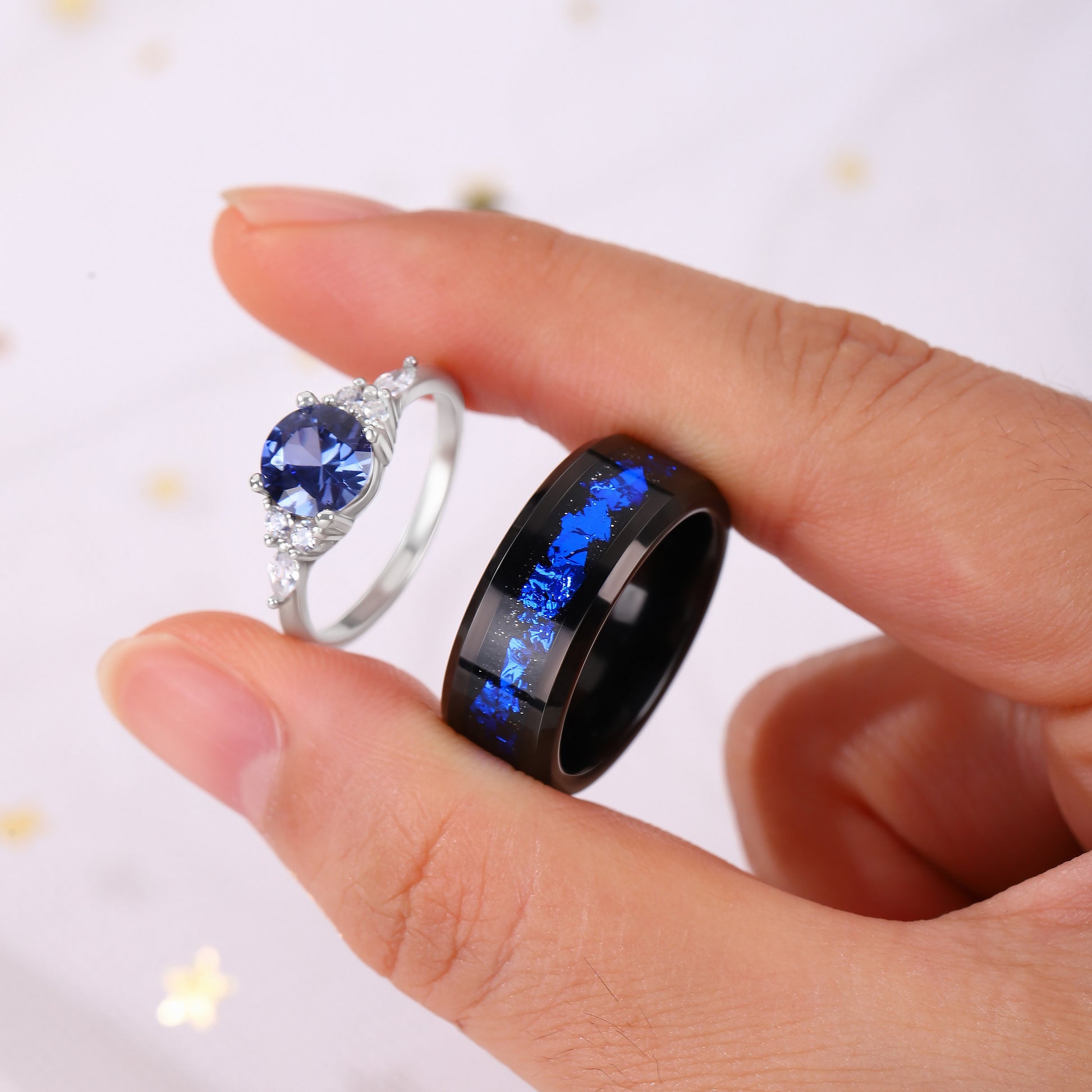Elegant couple ring set featuring vibrant blue corundum and shimmering black sandstone. Crafted in premium 925 sterling silver and durable black tungsten, this matching set blends timeless romance with modern luxury.