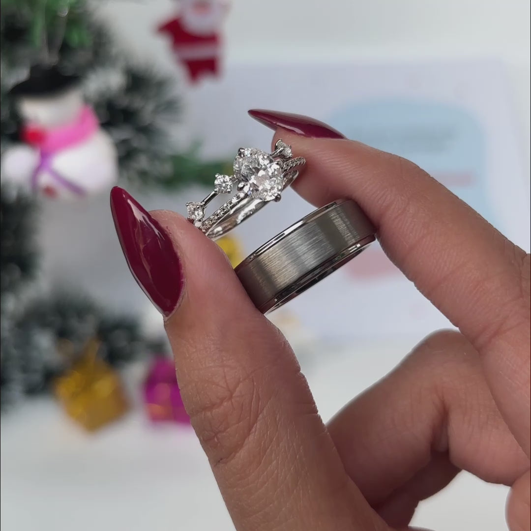 The men’s ring boasts a dark silver tungsten band with a classic yet contemporary design, exuding elegance and durability. Its understated charm reflects the enduring commitment and the strength of your bond.
