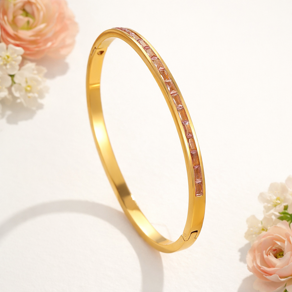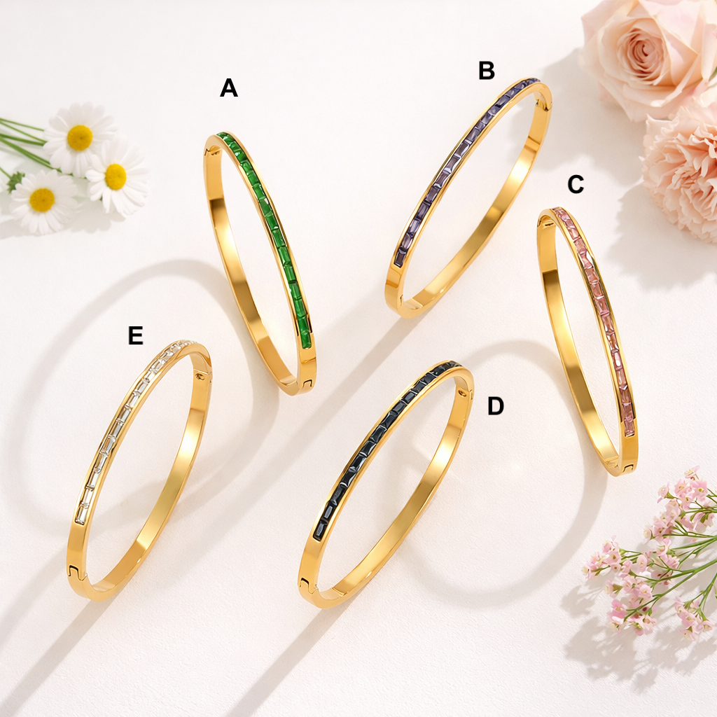 Elegant and modern, this 18K gold plated hinged bangle bracelet is crafted from durable stainless steel for long-lasting shine and strength. Featuring a sleek channel-set stone design and a convenient hinged opening, it offers effortless wear and a secure fit. With a 6.3 cm diameter, this minimalist statement bangle adds a refined touch to both everyday outfits and special occasions.