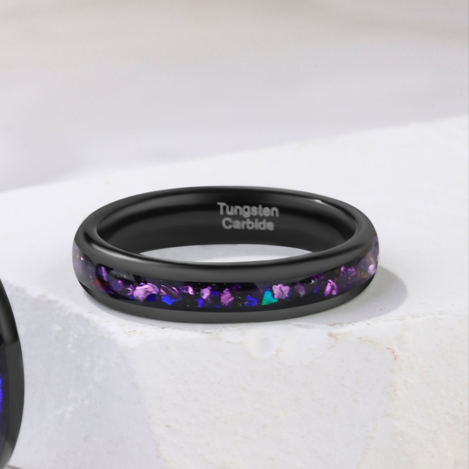 Celebrate a love that’s as vast as the galaxy with the Crushed Amethyst & Blue Galaxy Tungsten Couple Ring Set—a stunning blend of cosmic beauty and enduring strength.