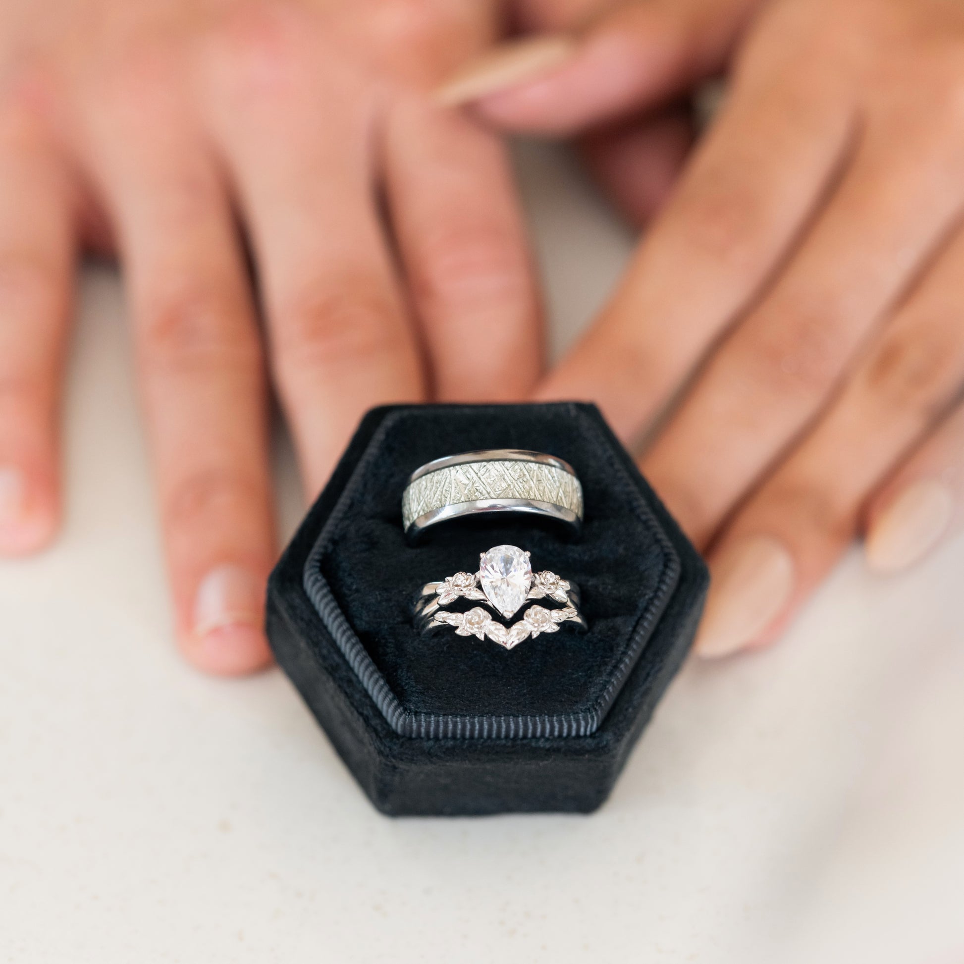 Celebrate your everlasting bond with this elegant couple ring set. The women’s ring features a pear cut simulated diamond set in 925 sterling silver, offering timeless sparkle and sophistication. The men’s ring is crafted from durable tungsten, symbolizing cosmic strength and eternity. Together, these matching rings represent love that shines as bright as the stars and endures as strong as the universe—perfect for engagements, weddings, or anniversary gifts.