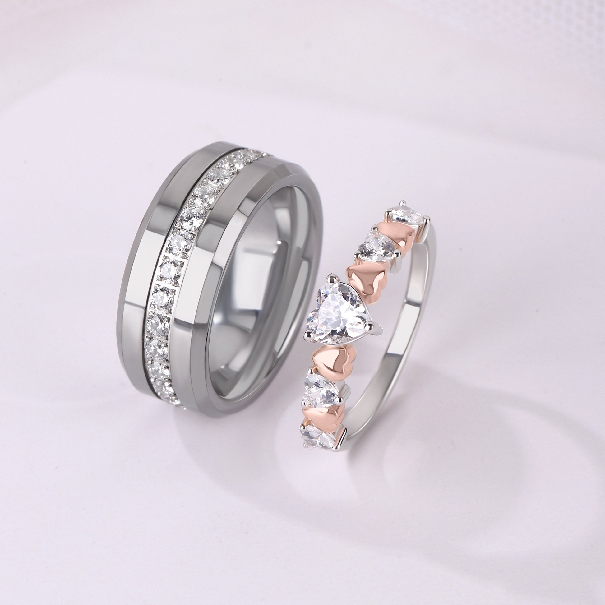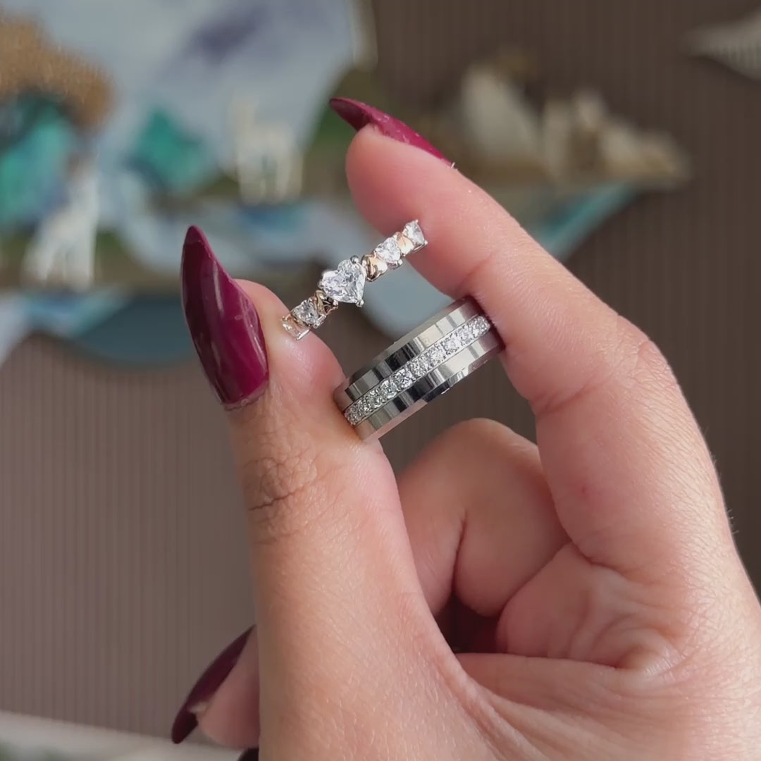 Elegant couple ring set featuring a 925 sterling silver women’s ring with sparkling simulated diamonds and a durable tungsten men’s band inlaid with brilliant simulated diamonds — perfect for promise, engagement, or anniversary gifting.