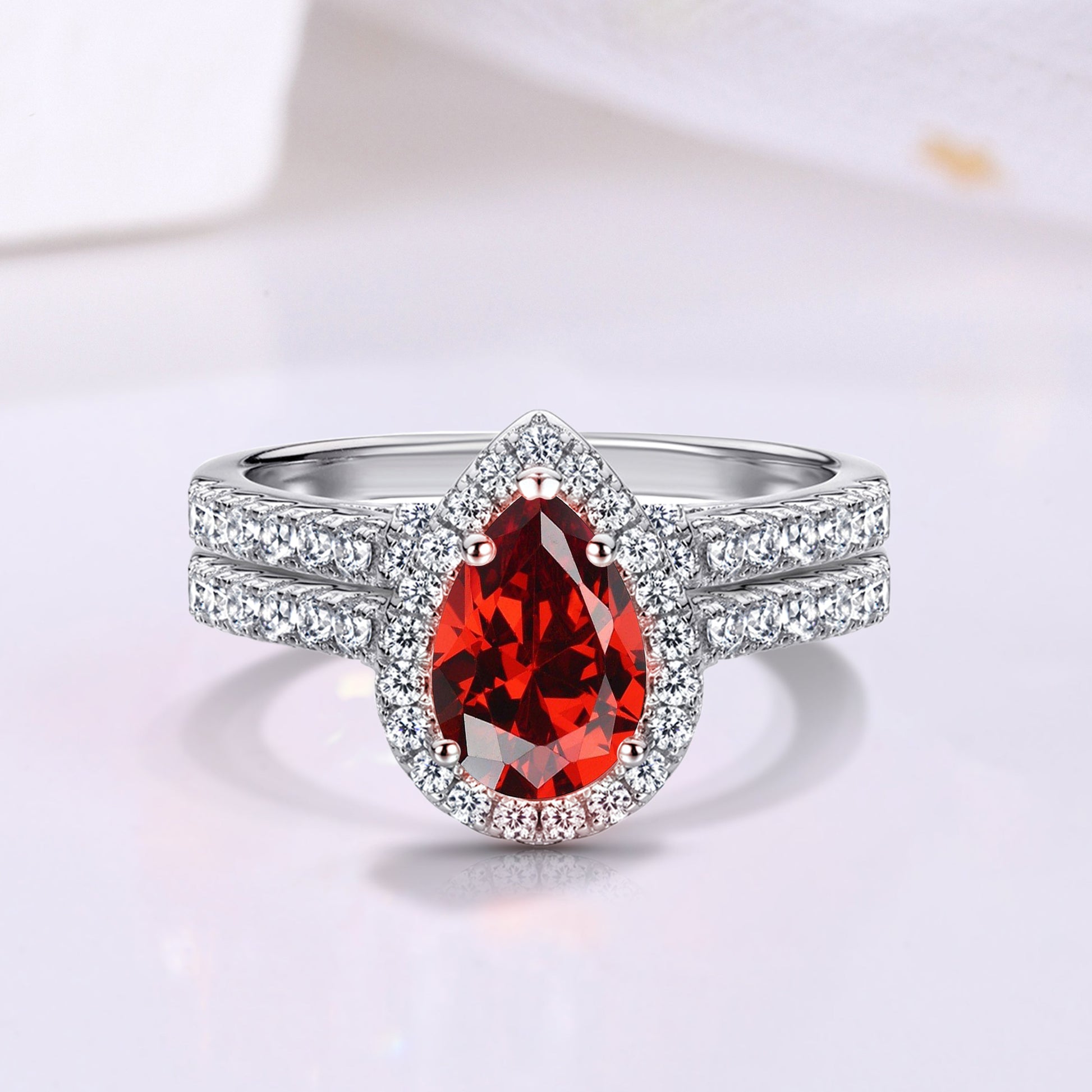 Elegant garnet couple rings featuring a pear-cut natural garnet on a 925 silver women's ring and black tungsten band with garnet inlay for men—crafted to reflect deep, lasting love.