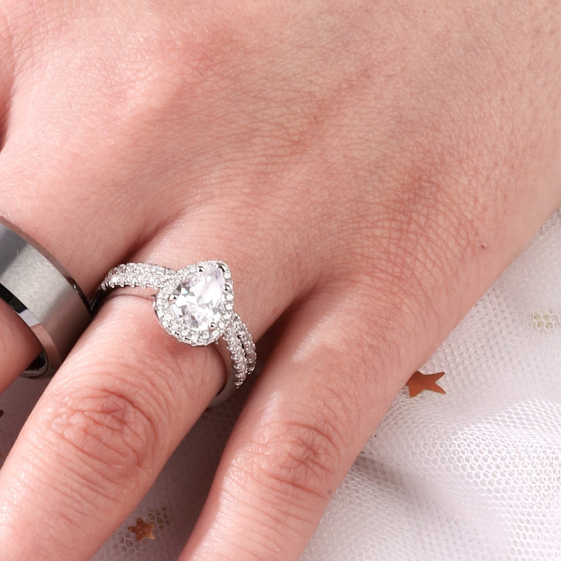 The women’s set is a stunning duo of a ring and matching band, designed to capture hearts. The centerpiece is a dazzling pear-shaped white diamond, delicately set to reflect brilliance from every angle.