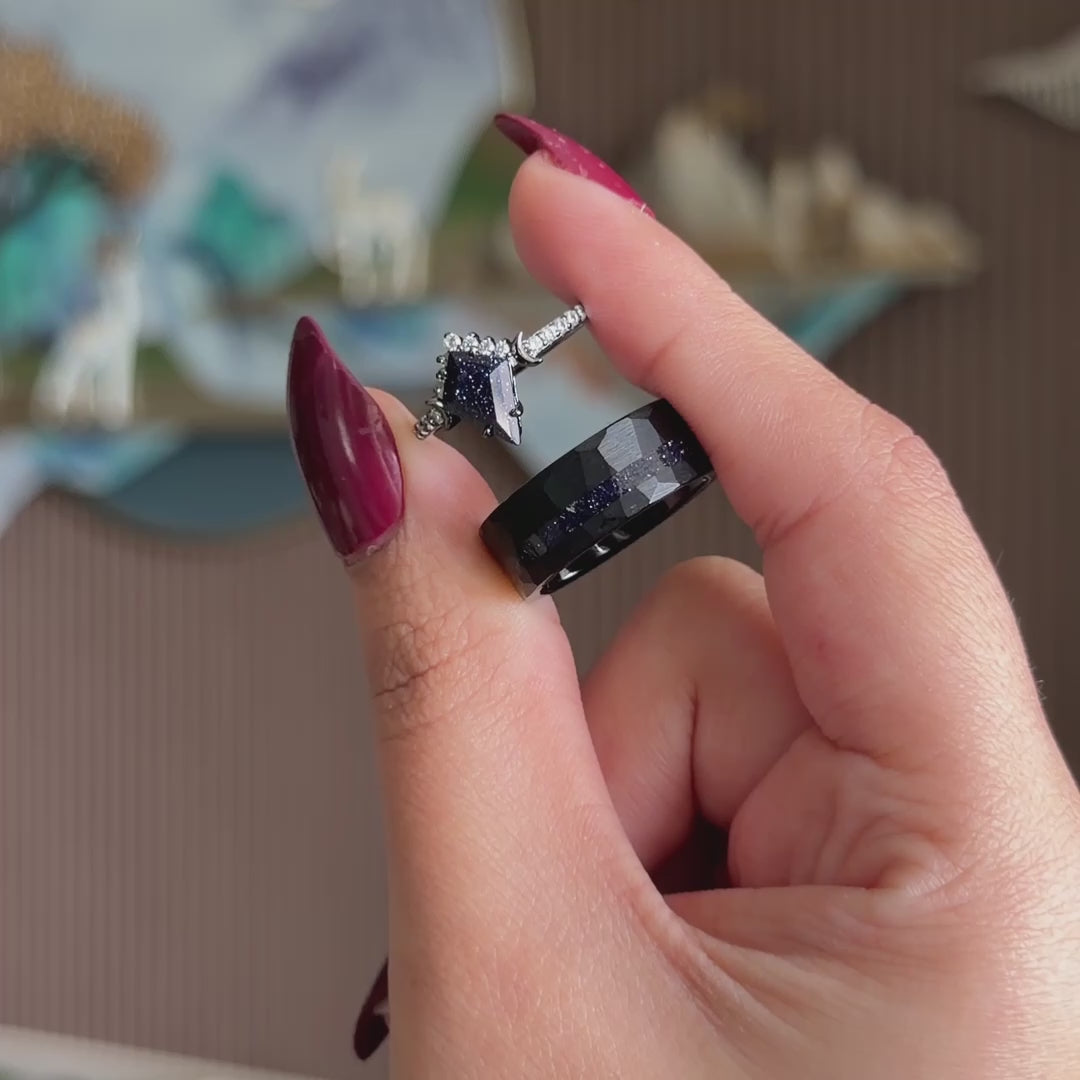 The Midnight - a captivating couple ring set featuring a faceted tungsten men’s band inlaid with shimmering blue sandstone, paired with a 925 silver women’s ring plated in black rhodium and set with a striking kite-cut blue sandstone. A perfect celestial-inspired symbol of love.