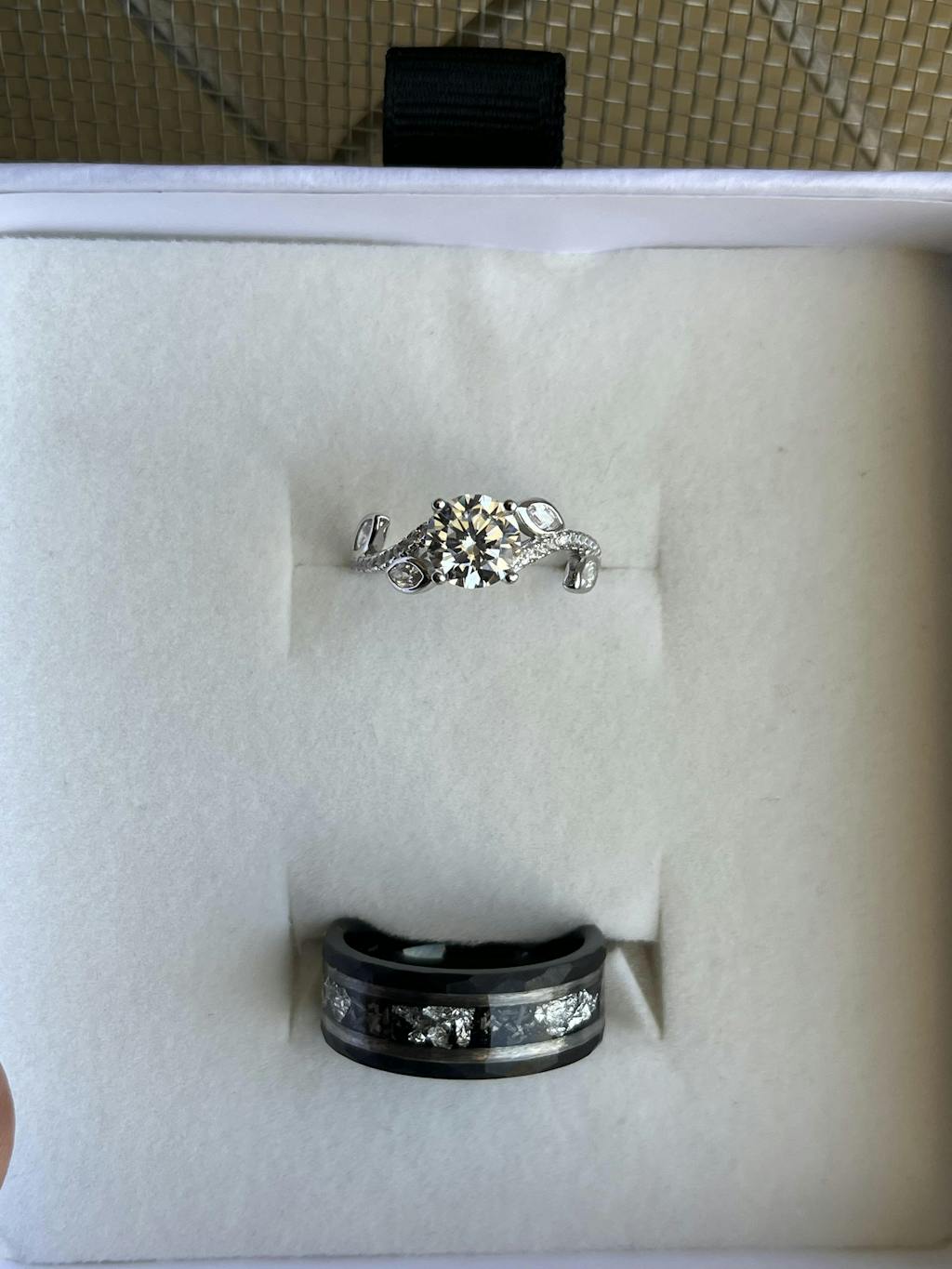 Crafted from premium tungsten, the men’s ring features a captivating meteorite-inspired design, symbolizing the enduring and cosmic nature of your bond. The women’s ring is a masterpiece of grace and brilliance. Made from 925 sterling silver, it showcases a dazzling 1-carat