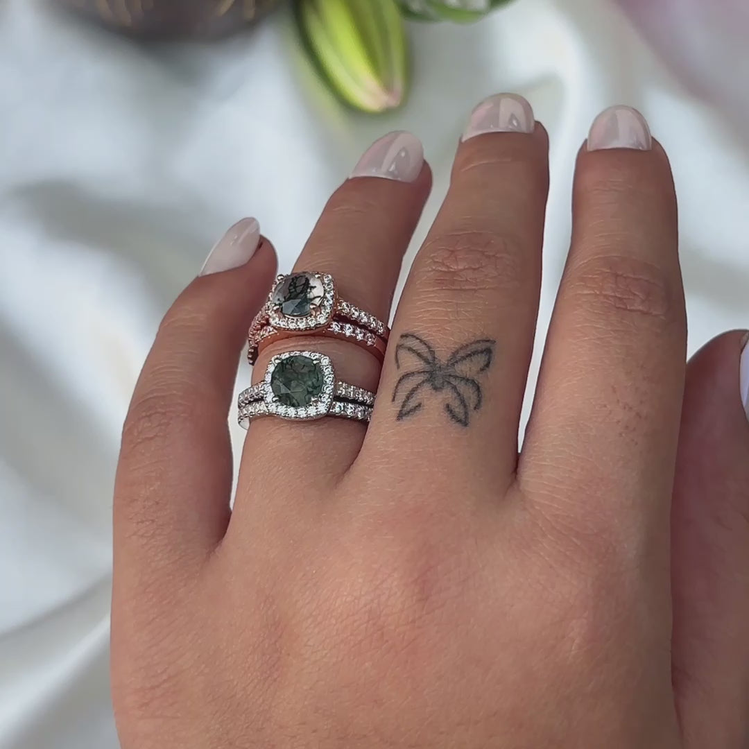 Celebrate love with the timeless beauty of nature in this Round-Cut Moss Agate Women's Ring Set. Designed for those who appreciate elegance with a unique touch, this set features a stunning 7mm round-cut moss agate at its center—each stone carrying intricate green inclusions that resemble a miniature forest, making every ring truly one of a kind.