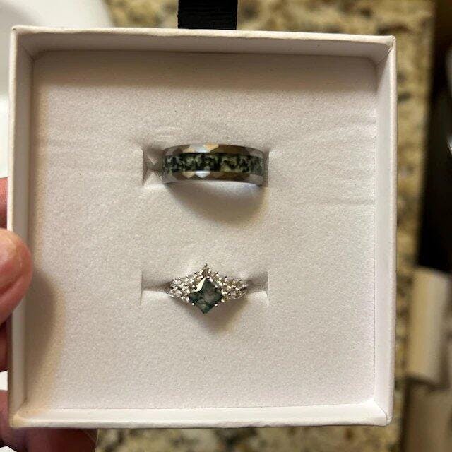 Celebrate your bond with this stunning moss agate couple ring set — crafted for lasting love and natural elegance. The women’s ring features a 925 sterling silver band adorned with a square-cut moss agate and sparkling simulated diamonds, while the men’s tungsten ring showcases a matching moss agate inlay with a hammered edge finish. Perfect for couples who cherish nature-inspired beauty and timeless design.